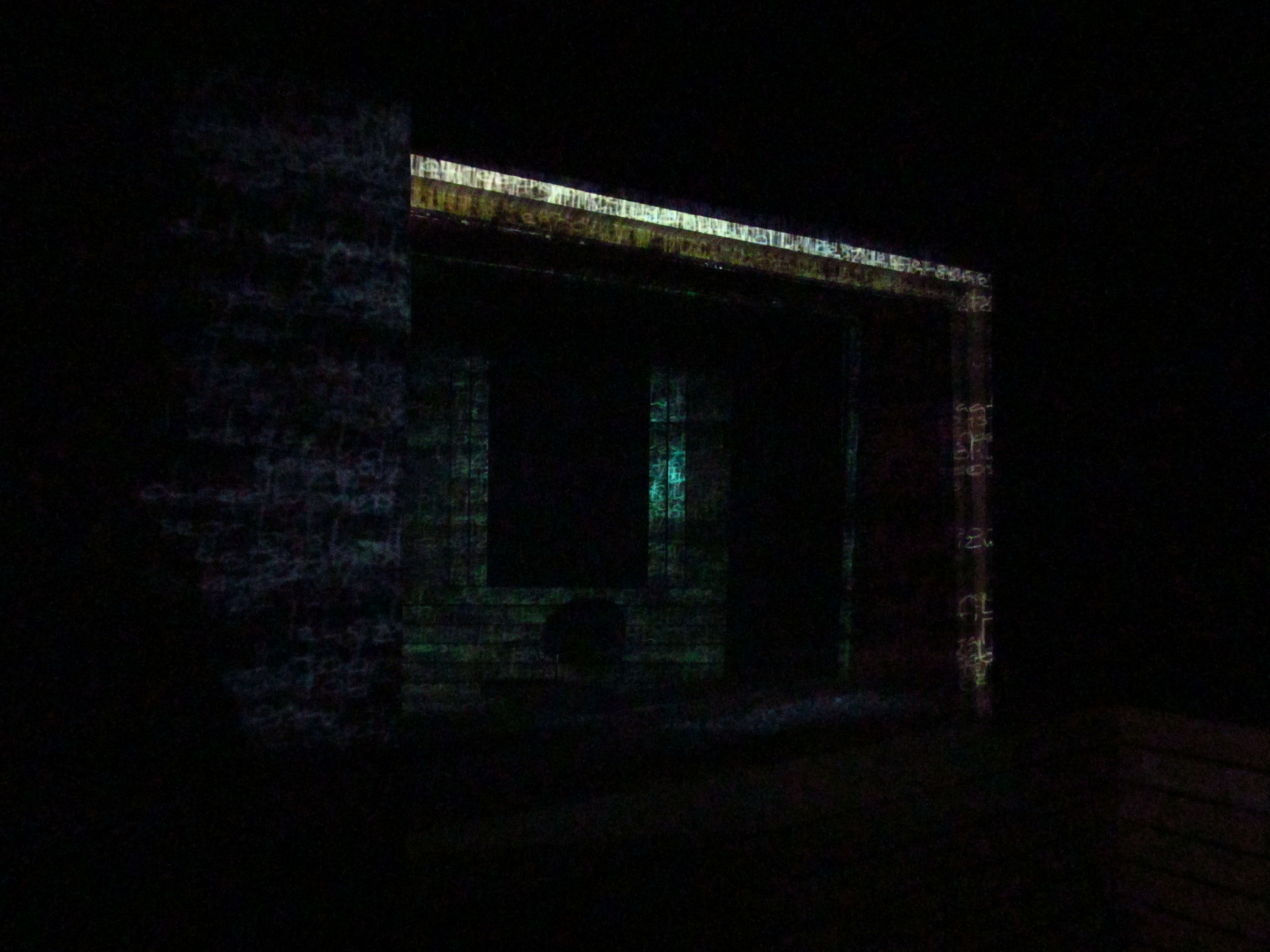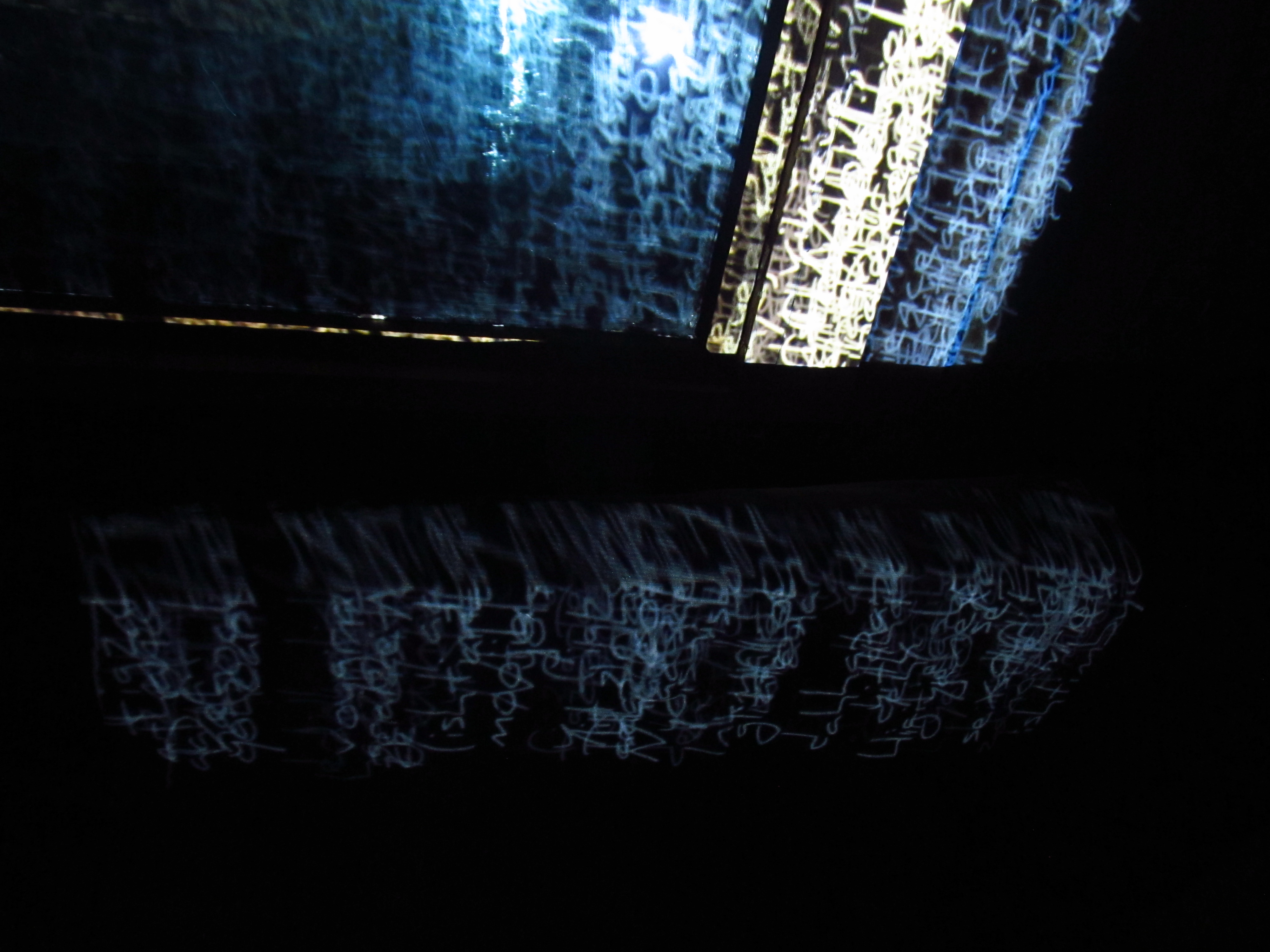 My work "EnkrrOach" takes the recognizable Roman characters and creates a generative visual of a string of nonsensical text. The projection is a rapid and continuous placement-over-placement and disappearance of gibberish. The accompanying audio is also illegible, non-understandable, and yet it communicates through the tonal modulation, the loudness, the whispers, the pauses. It was originally projected over a set of two glass windows in the dark.
