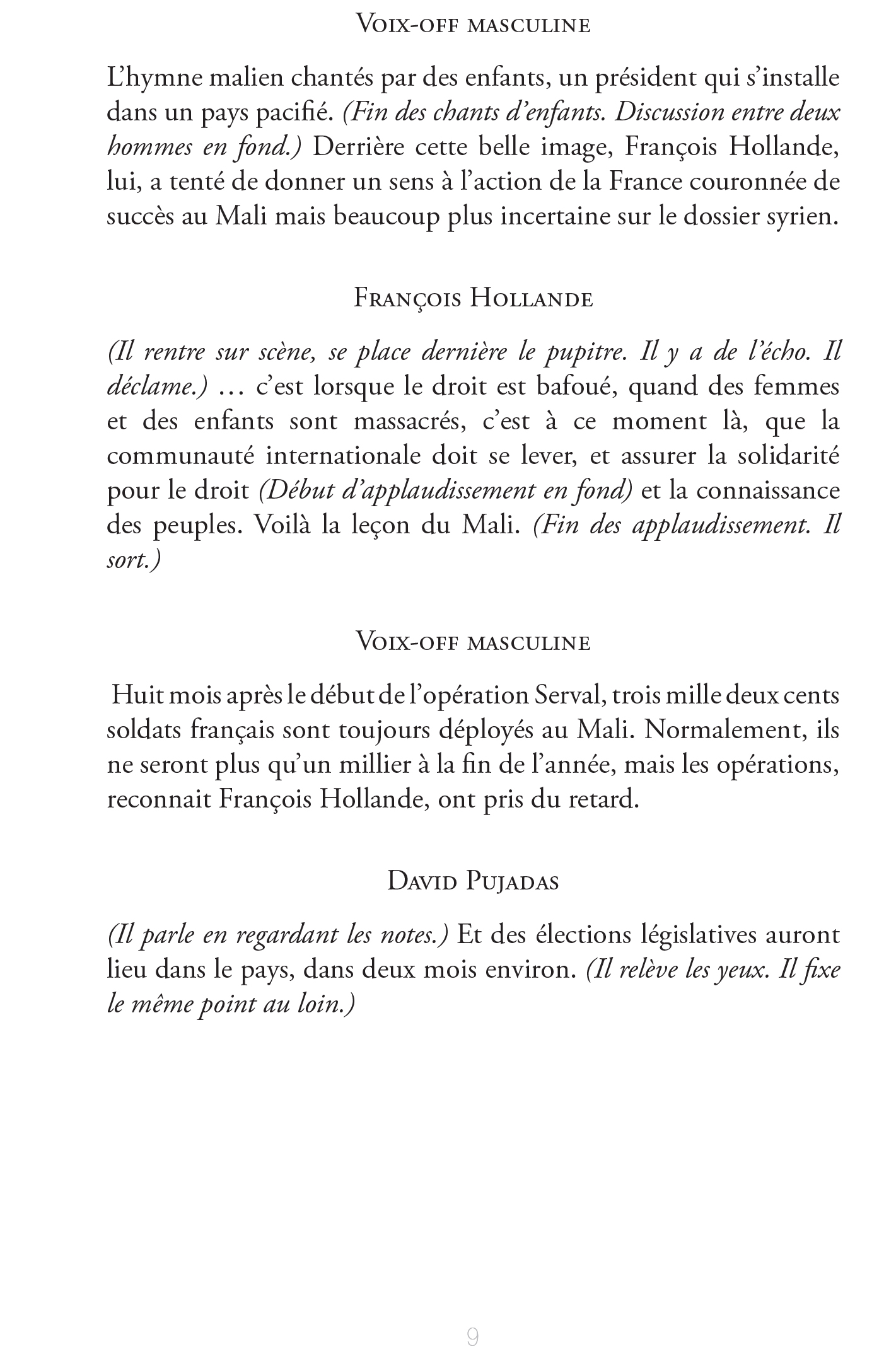 An open form based on TV news reshaped into a text of classical theatrical piece and played by professional actors. It has been activated once in a art space in Nîmes (France).