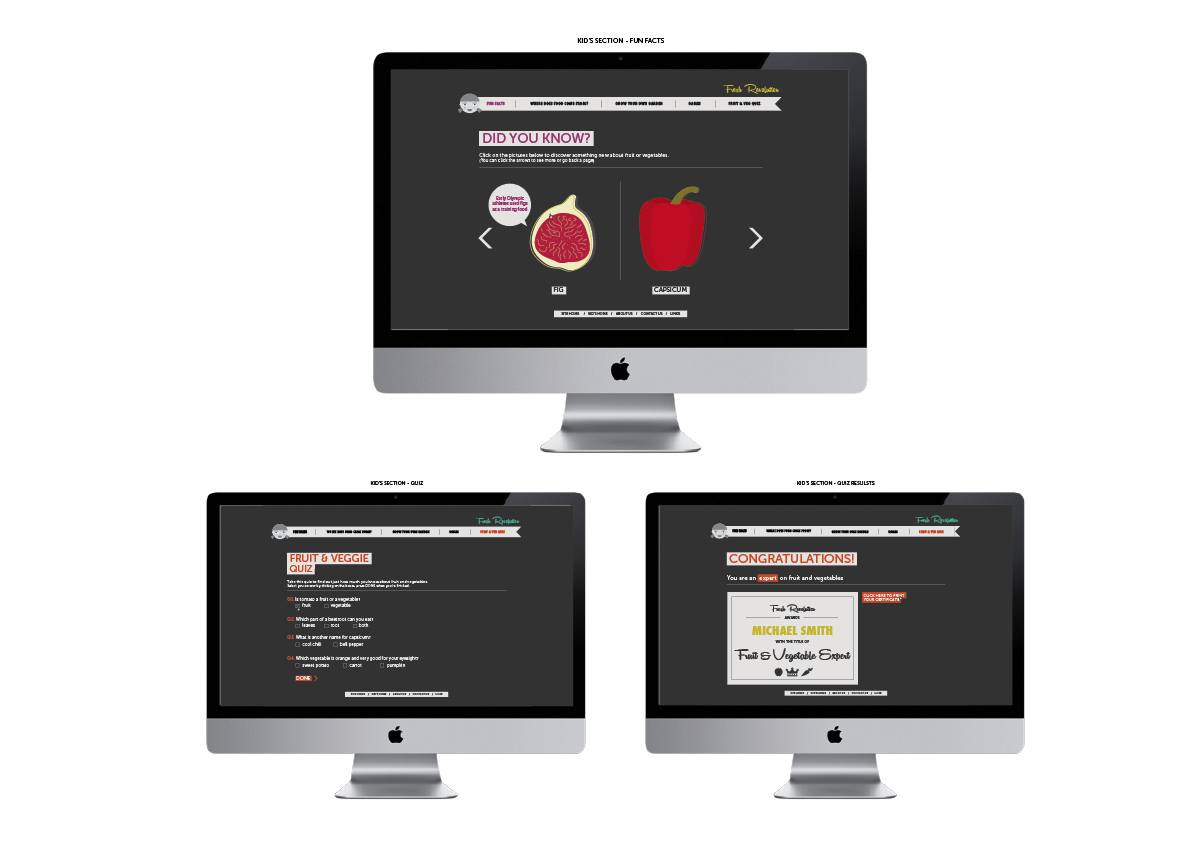 My work is intended to be implemented in the school and other educational environments, specifically in Australian primary schools. The posters would be displayed in schools, possibly even in homes with young children. The flyer is designed to be taken home to parents from schools, providing a variant view and reason of healthy eating of families. The website is appropriate for both children and parents to use, and is clearly segregated in accordance to the two different target audiences. It is designed to be an enjoyable yet informative online experience.