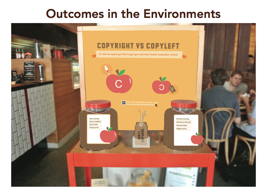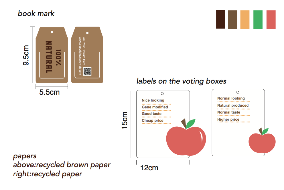 when people purchased from the restaurant, they will get a mock-up seeds to vote one type of apple they prefer, and they can take the book marks as well, to know more information, and go to website to check the “results“ at their persnal space