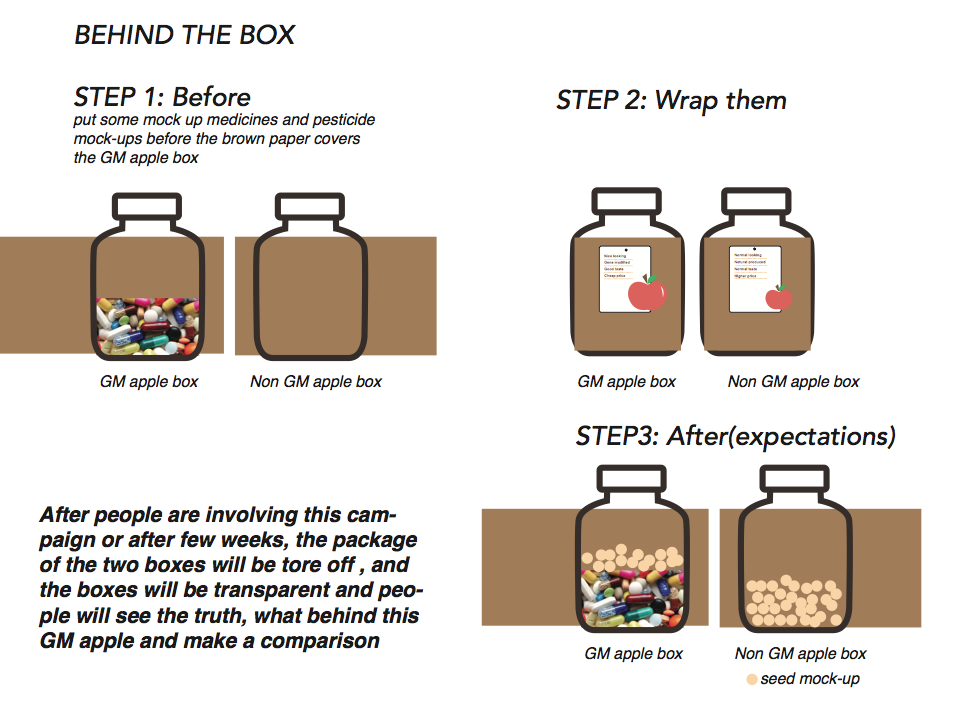 -Make people involving and educating them the dangers of GM food first, and the back stories of GM foods. Concept -To create an organisation, and start from a VOTE campaign, using people’s daily fruit APPLES to get people’s attentions, and then leading them into the further education progress
