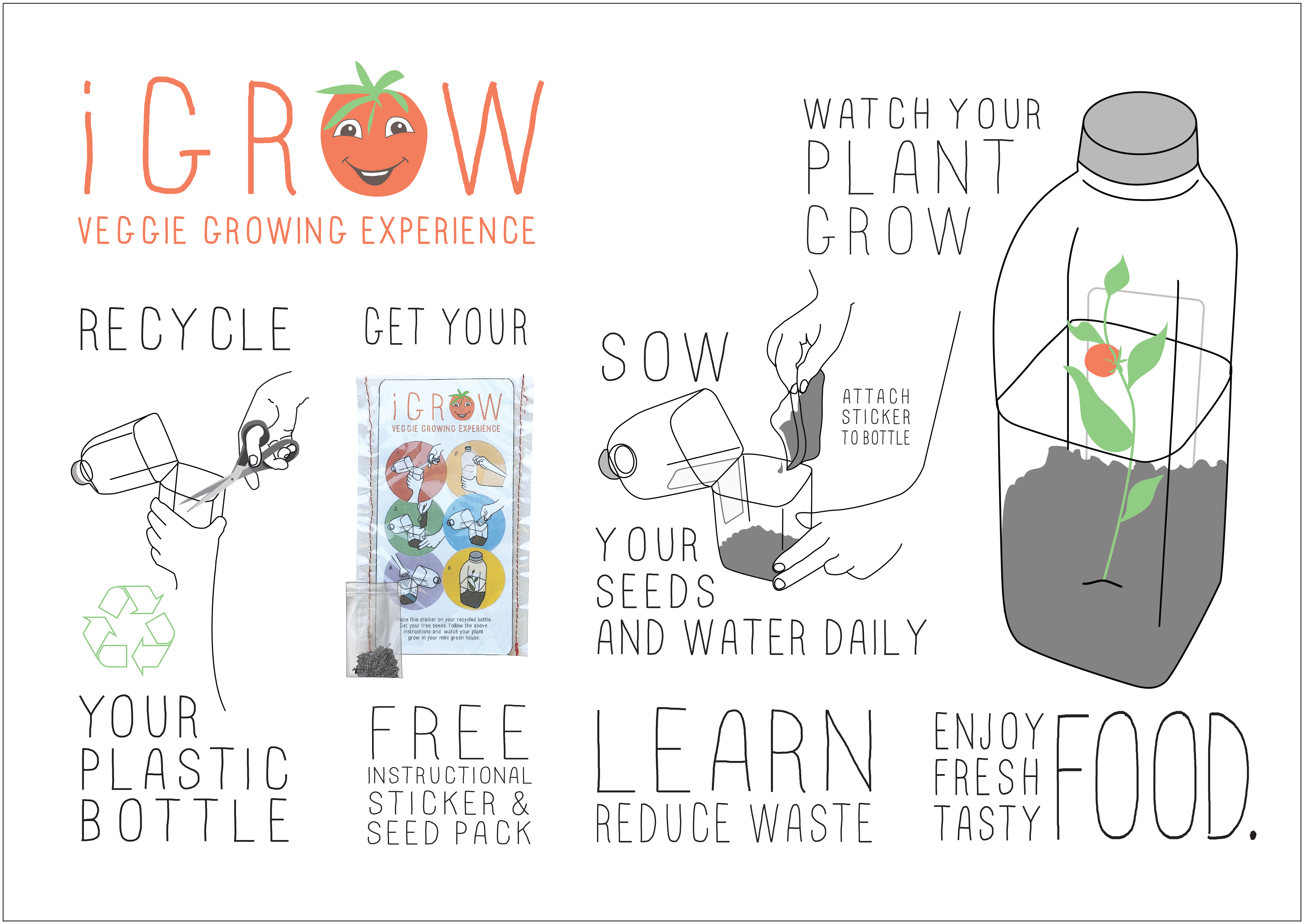 For every plastic bottle a child saves, they will receive a free plant growing kit, consisting of a sachet of mini tomato seeds and free instructional sticker, all in the one pack. The sticker shows a simple instructional diagram how to convert the bottle into a mini plant growing green house, while on the back, conveys the instructions in text.