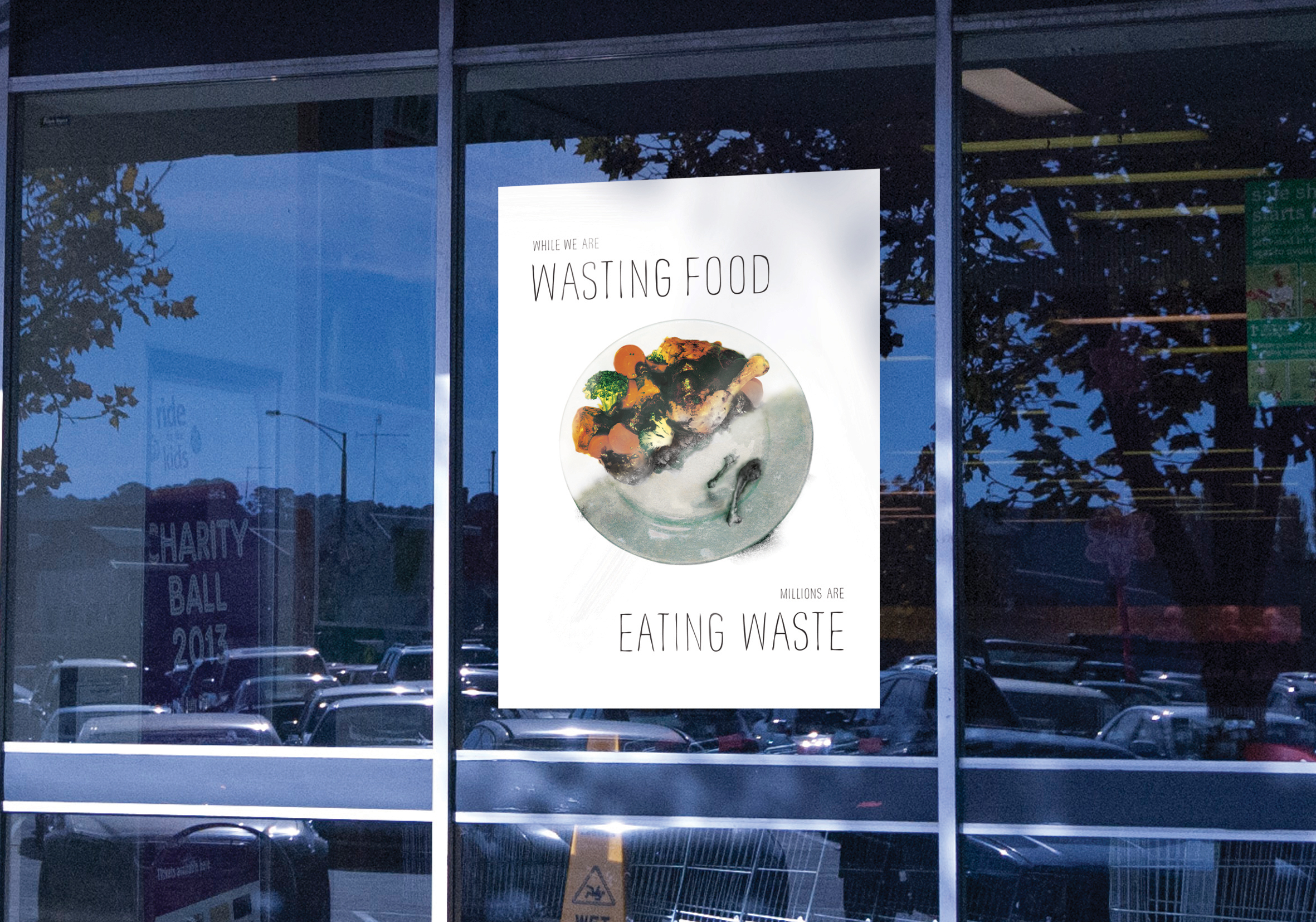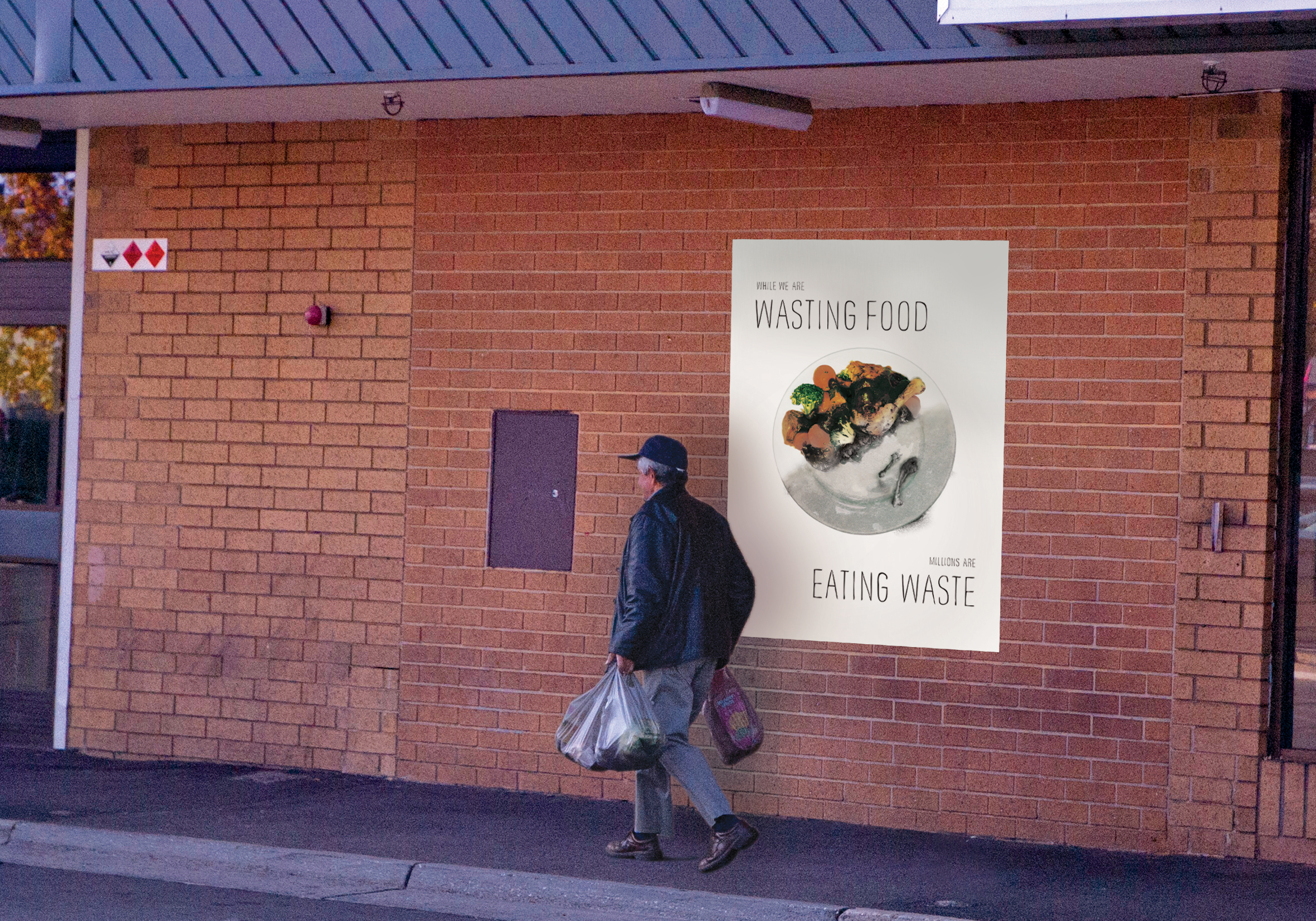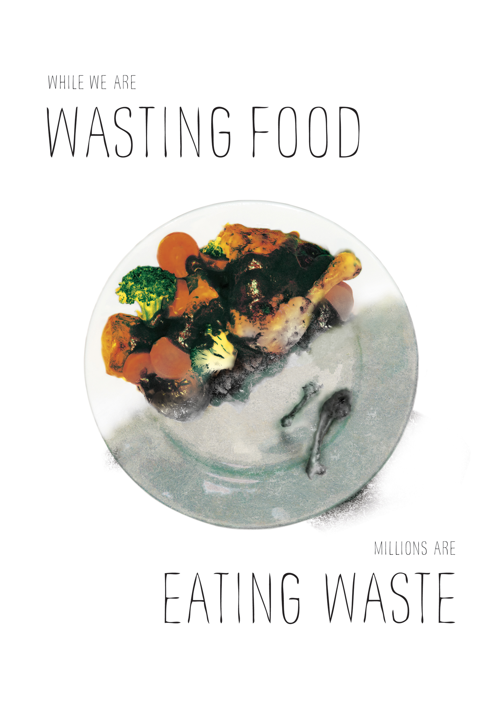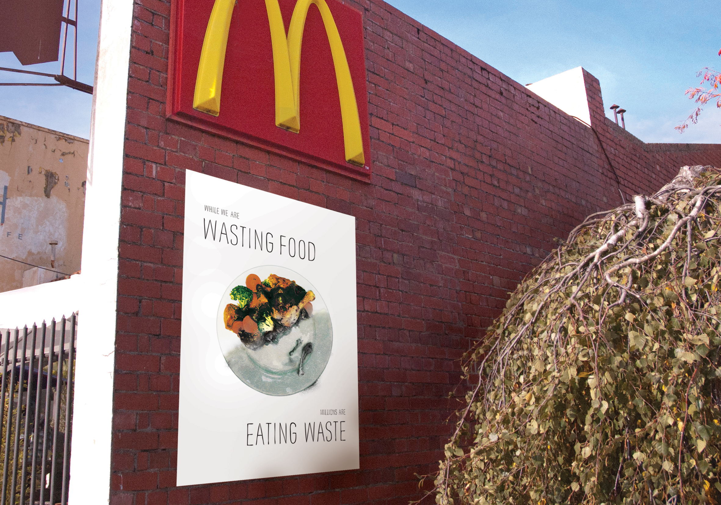 I have intended for this poster to be displayed on the facades of fast food restaurants and supermarkets because these are places where people commonly overeat and discard fresh, consumable food. Rather than make people feel guilty about their eating habits, I hope that my poster raises awareness of this issue