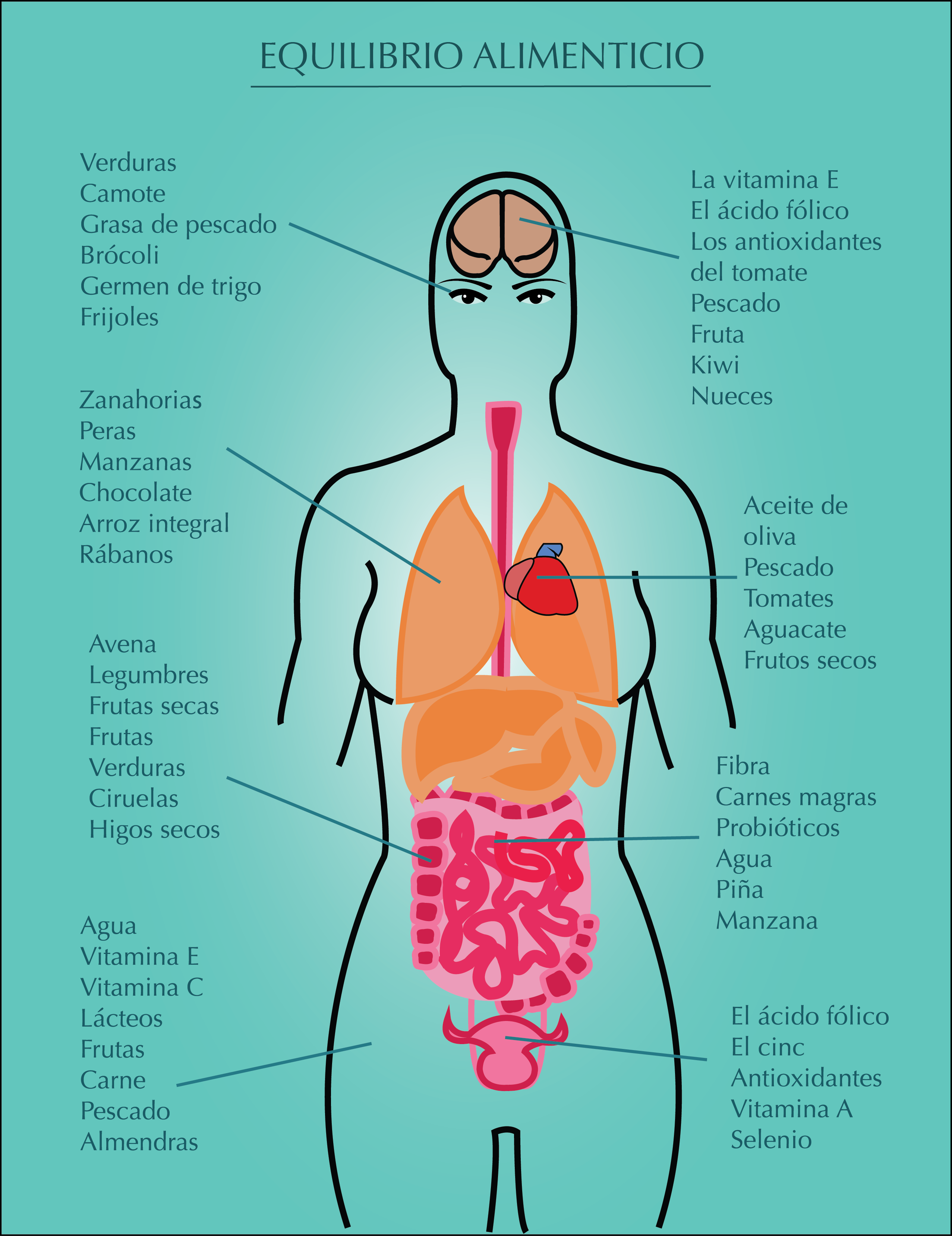Mi idea esta presentada en un cuerpo humano en el cual se muestra cuales son los alimentos que debe consumir nuestros órganos para un mejor funcionamiento, cuando estos faltan o es mínimo su consumo el cuerpo empieza a sufrir una serie de desequilibrios que terminan por descompensar el nuestro cuerpo