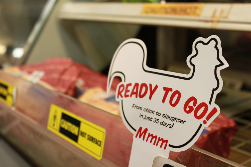I like this one mainly due to it's simple skilful appropriation of shopping slogans and the deft visual execution. This is a template that could maintain relevance by continually feeding off and undermining the supermarket's own marketing - 'Ready to Go: from chick to slaughter in just 35 days!... Mmm'.
