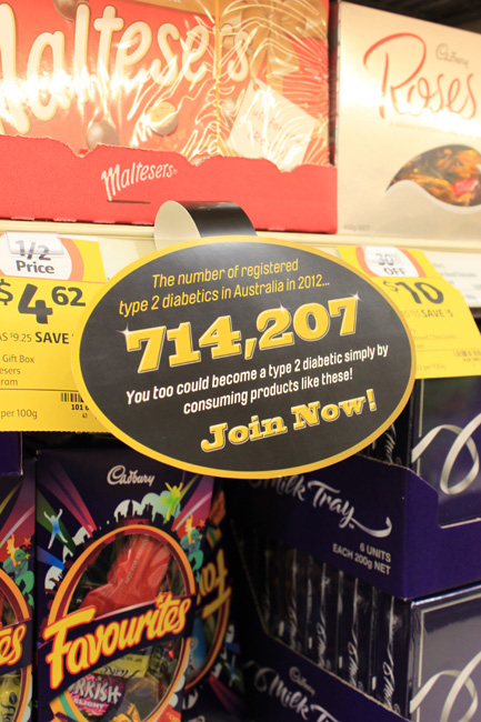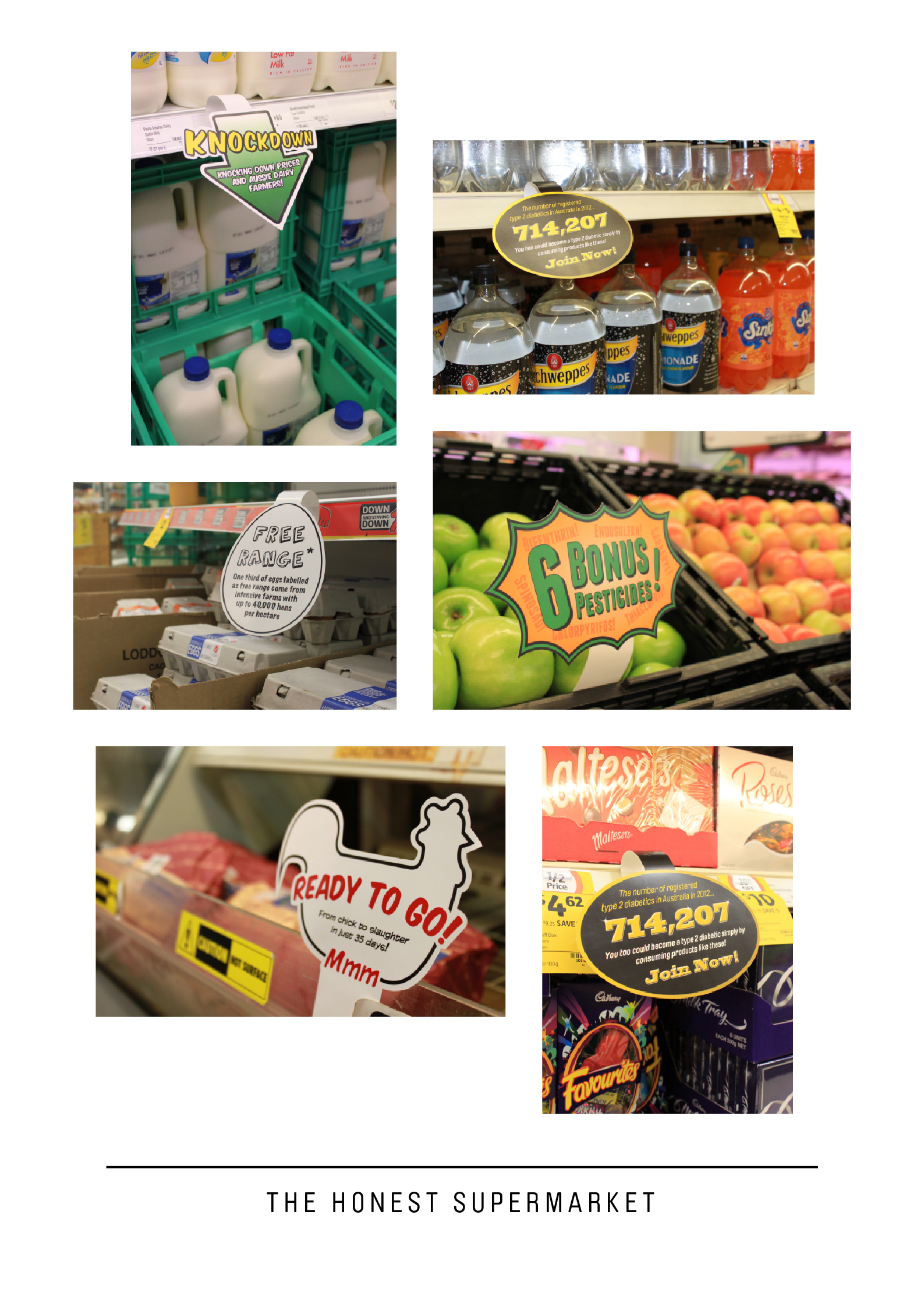 To achieve my aim I created a series of wobblers (little paper signs that dangle off supermarket shelves) each displaying the shocking facts about the products I targeted. I decided to use wobblers as they are usually used by companies and supermarkets to display the good facts about their products and therefore many people read them. I made my wobblers look like regular ones, using bright colours and big bold fonts with words such as “Bonus” and “Knockdown” to draw the public’s attention. The difference with my wobblers however is that once you’re drawn in by the headings, you then read the facts about the products that the supermarkets don’t want you to know. These facts were: • Meat chickens lifespan from chick to slaughterhouse can be as short as 35 days. • Hundreds of dairy farmers are being forced to stop farming due to the supermarkets selling their milk at just $1 a litre. • One third of eggs labelled a free range are from intensive farms with up to 40,000 hens per hectare. • There are a number of pesticides sprayed on apples during their growth including; Chlorpyrifos, Bifenthrin, Carbaryl, Endosulfan, Thiacloprid and Spinosad. • The number of registered type 2 diabetics in Australia in January 2012 was 714,207. This will hopefully result in preventing the public from purchasing the product as the off-putting information is fresh in their mind.