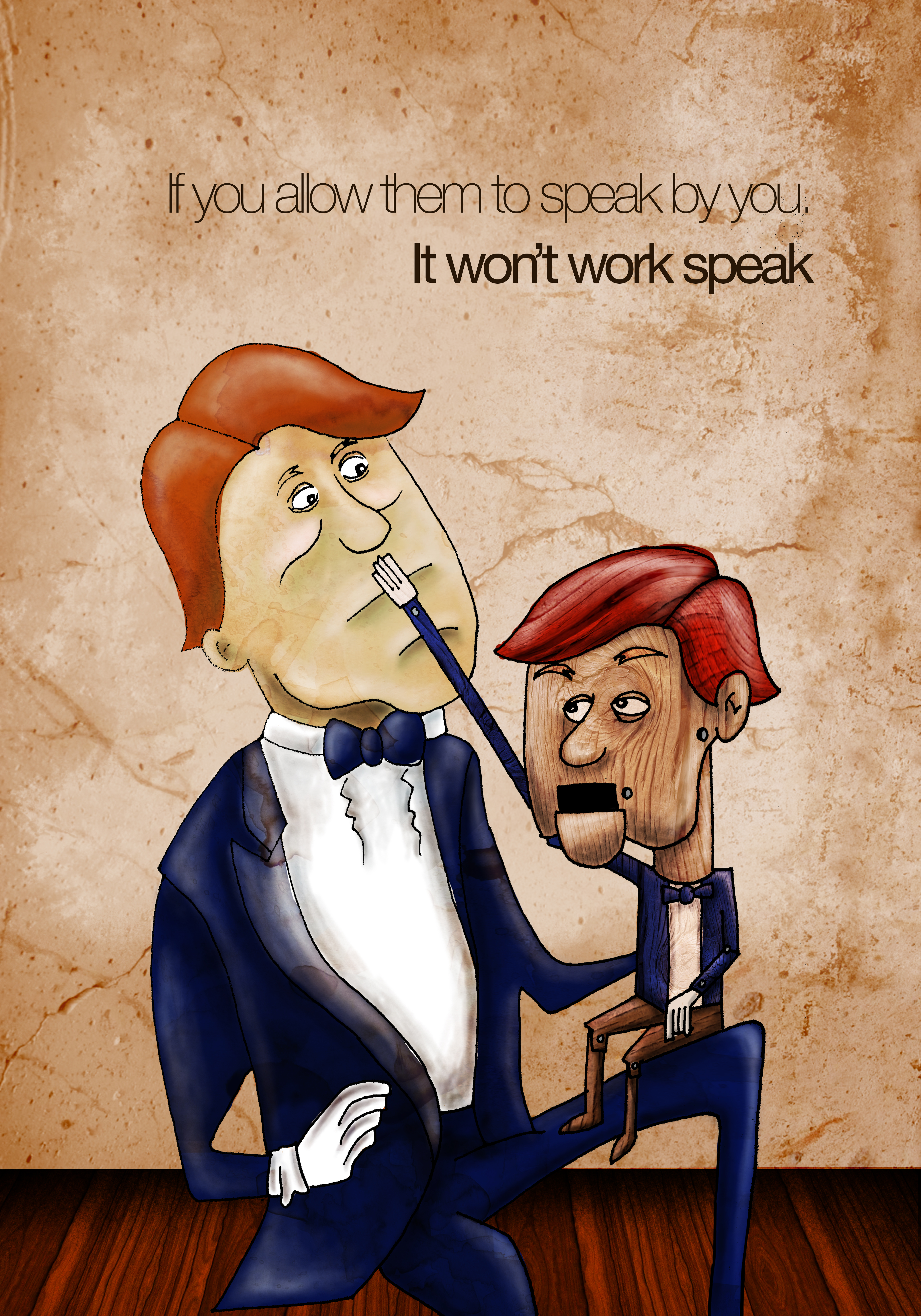 Por eso hice un ventrílocuo con su muñeco, en donde este le está cubriendo la boca con el fin de que su amo no hable más por él.