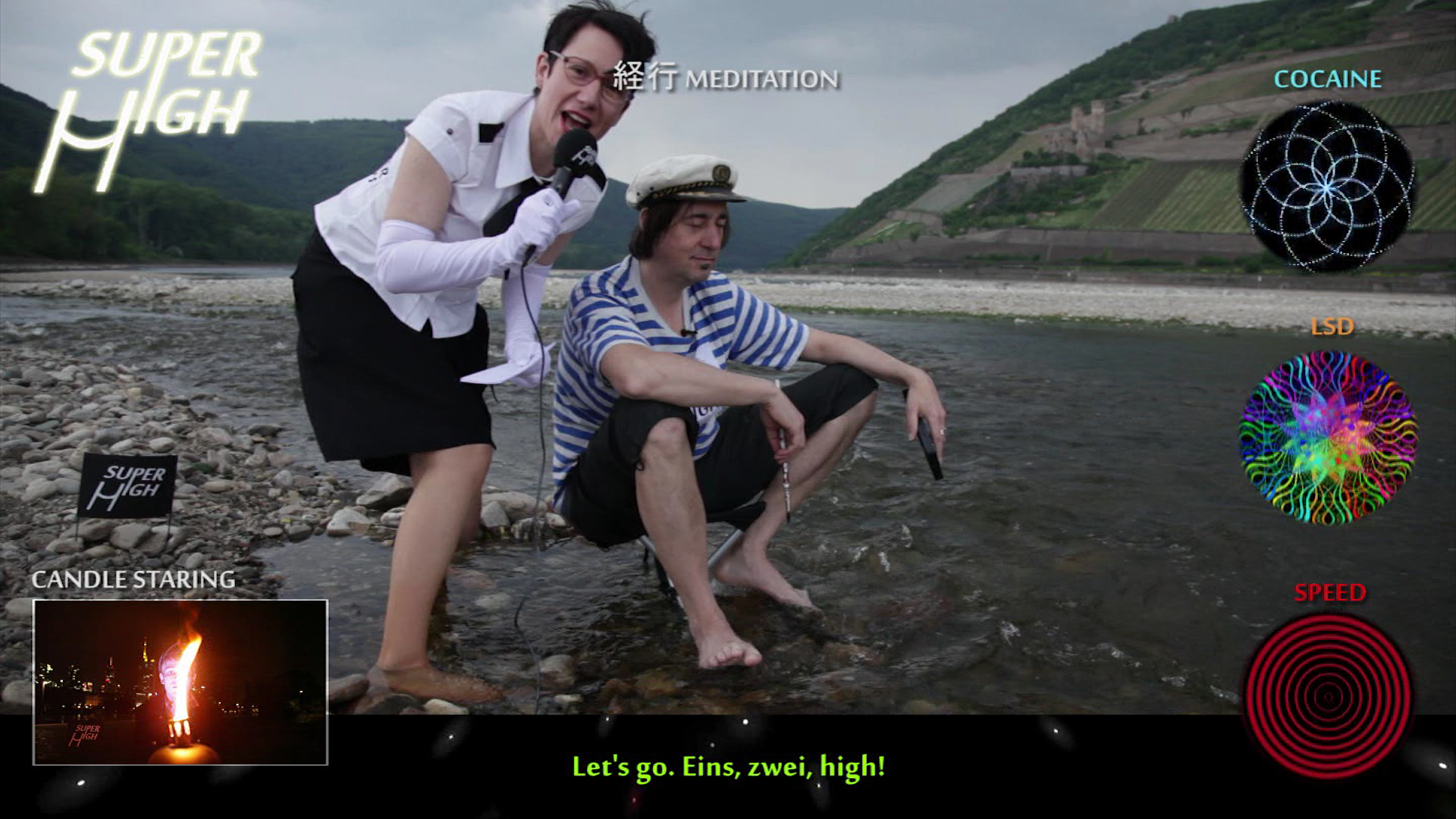 In the video work, six candidates showcase methods of getting high without drugs (Candle Staring, Knock Out Kiss, Whirling Dervish, 12 Cycle Meth Breath, Kin Hen Meditation and more). Personified drugs – Cocaine, LSD and Speed – form the jury and judge their efforts. In round II, the candidates combine two drug-free methods, while Ketamine, MDMA and Marihuana are joining the jury.