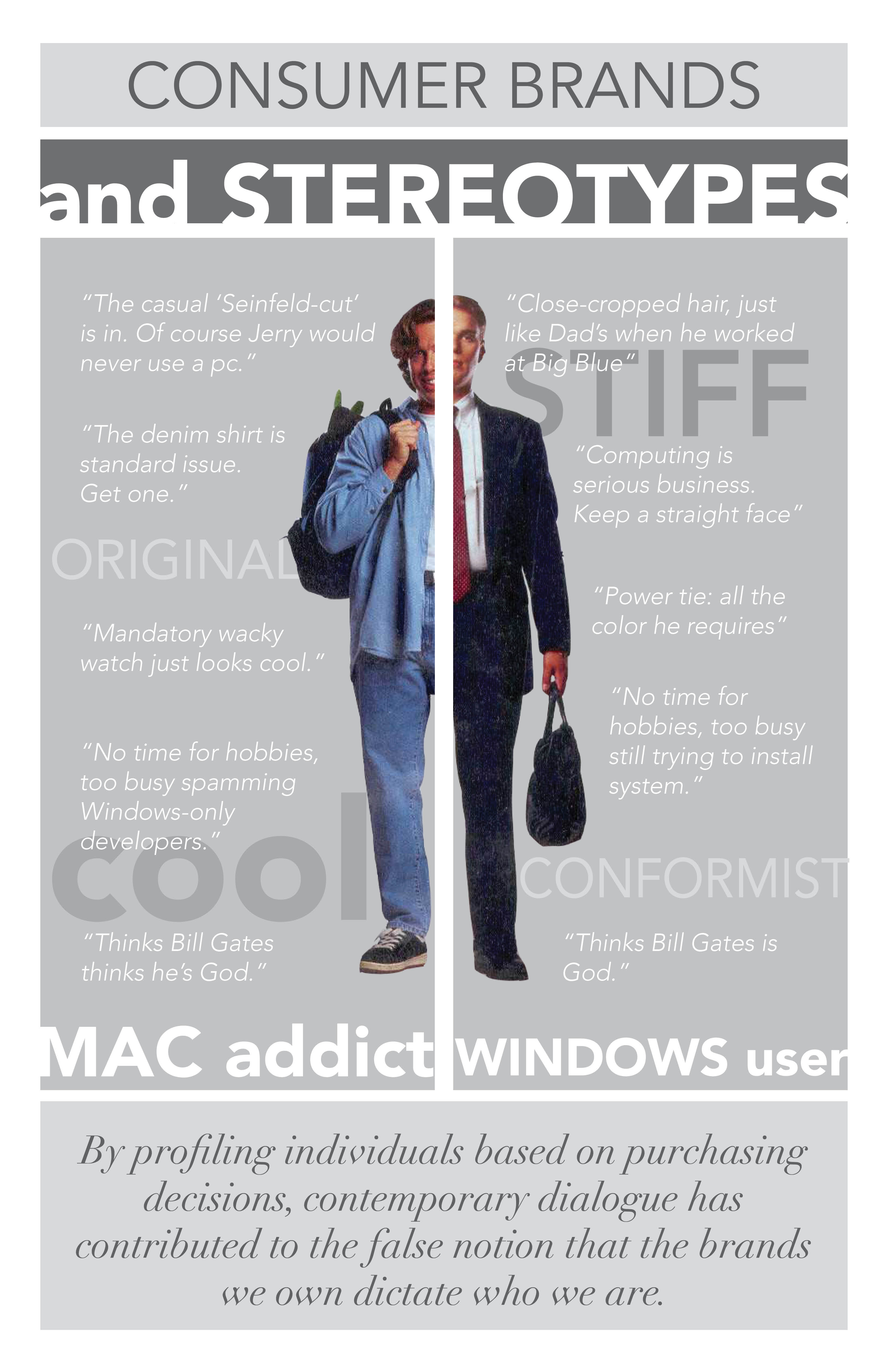My poster focuses on how contemporary dialogue has played an active role in aligning certain consumer brands with stereotypes. In turn, these connotations feed into the idea that consumer purchases can define a person.