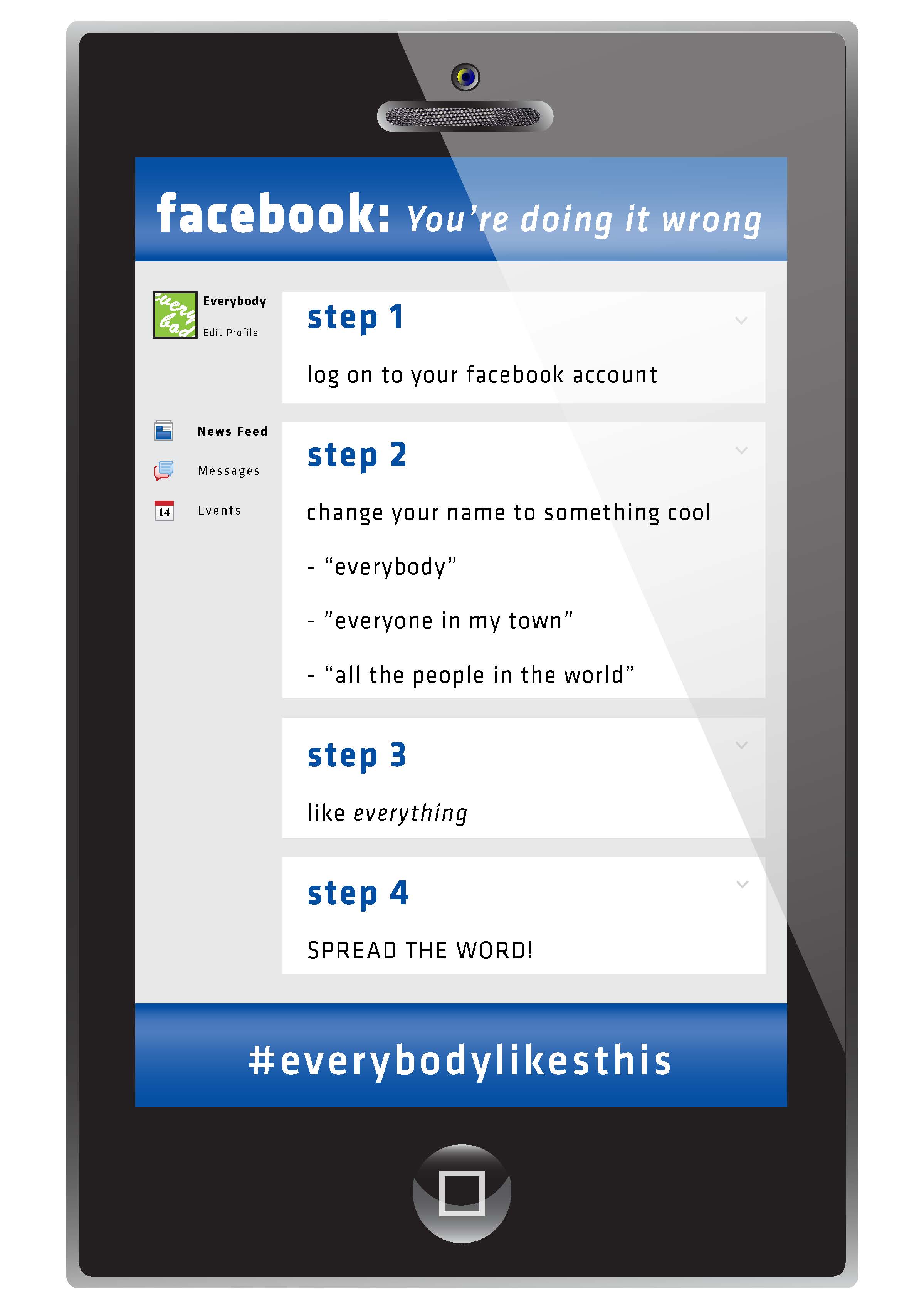 I started the experiment myself by changing my profile name to “Everybody”. By doing this, everything on Facebook I liked would instead display “Everybody likes this” rather than my original name. This showed the user that they were popular in their own right. I also created a Facebook page of the same name so when it would appear in newsfeeds it would simply read “Everybody likes everybody” or even “Everybody and seven other friends like Everybody” with a few of my peers jumping on board.