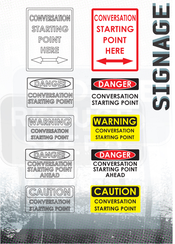 My concept focuses on the places that dialogue fails rather than the reasoning behind failed dialogue. It uses these locations as a means to promote good communication. Commenting on dialogue through signage, I was able to take a previous method of communication and place it in a different situation creating a completely different feel. Using language such as “warning” and “caution” draws attention to the message, also aided through the colour and placing of the signage.