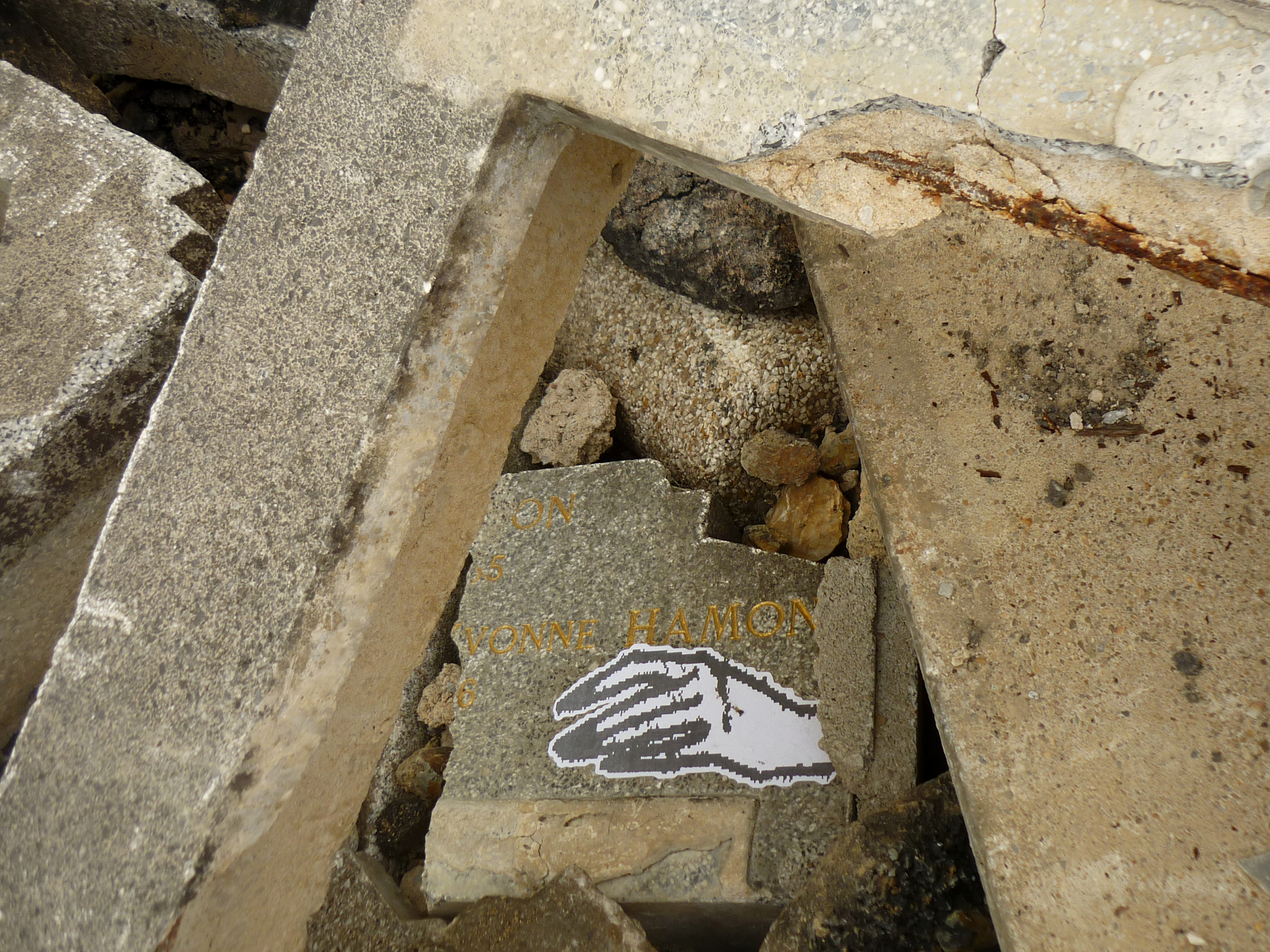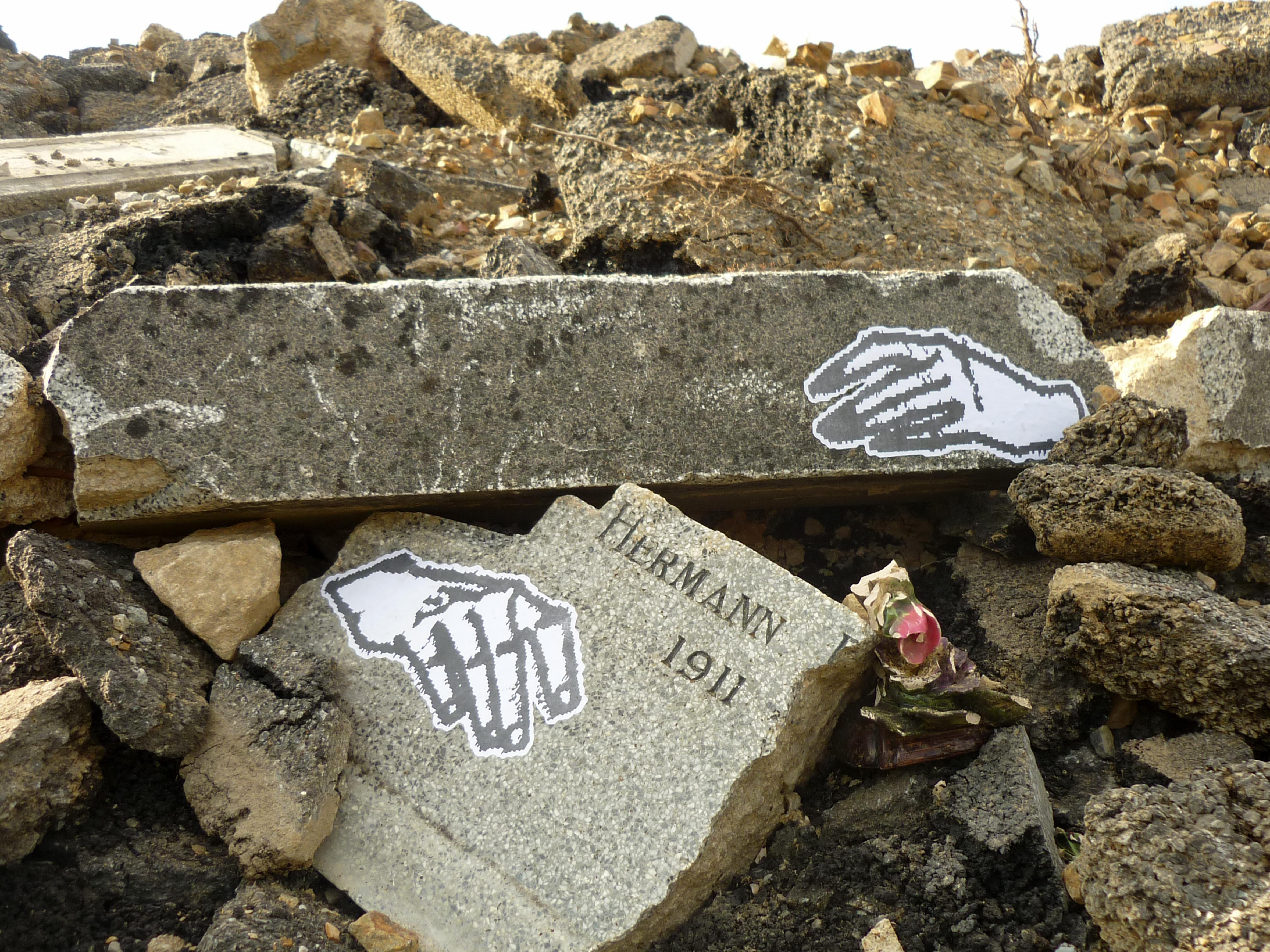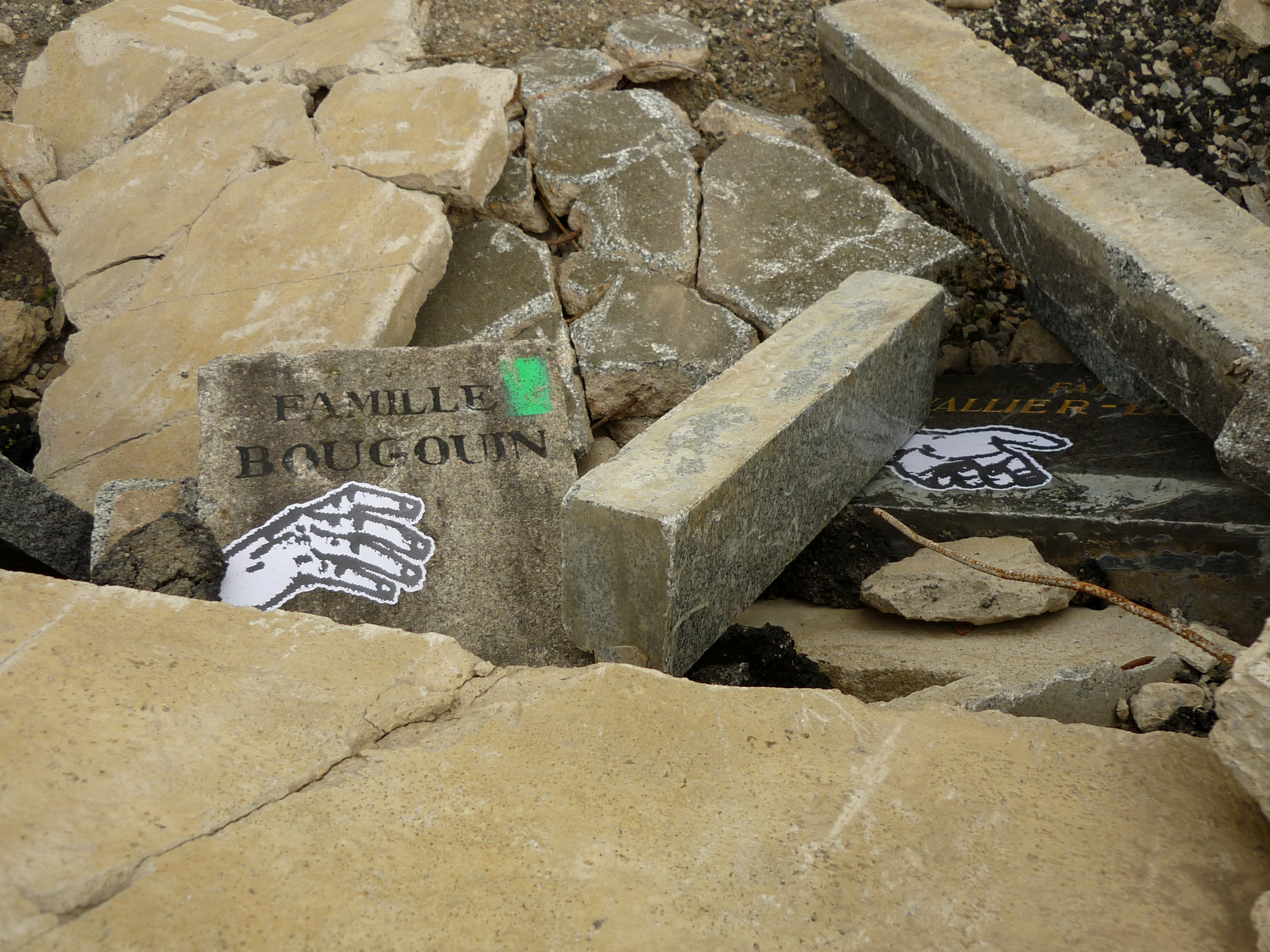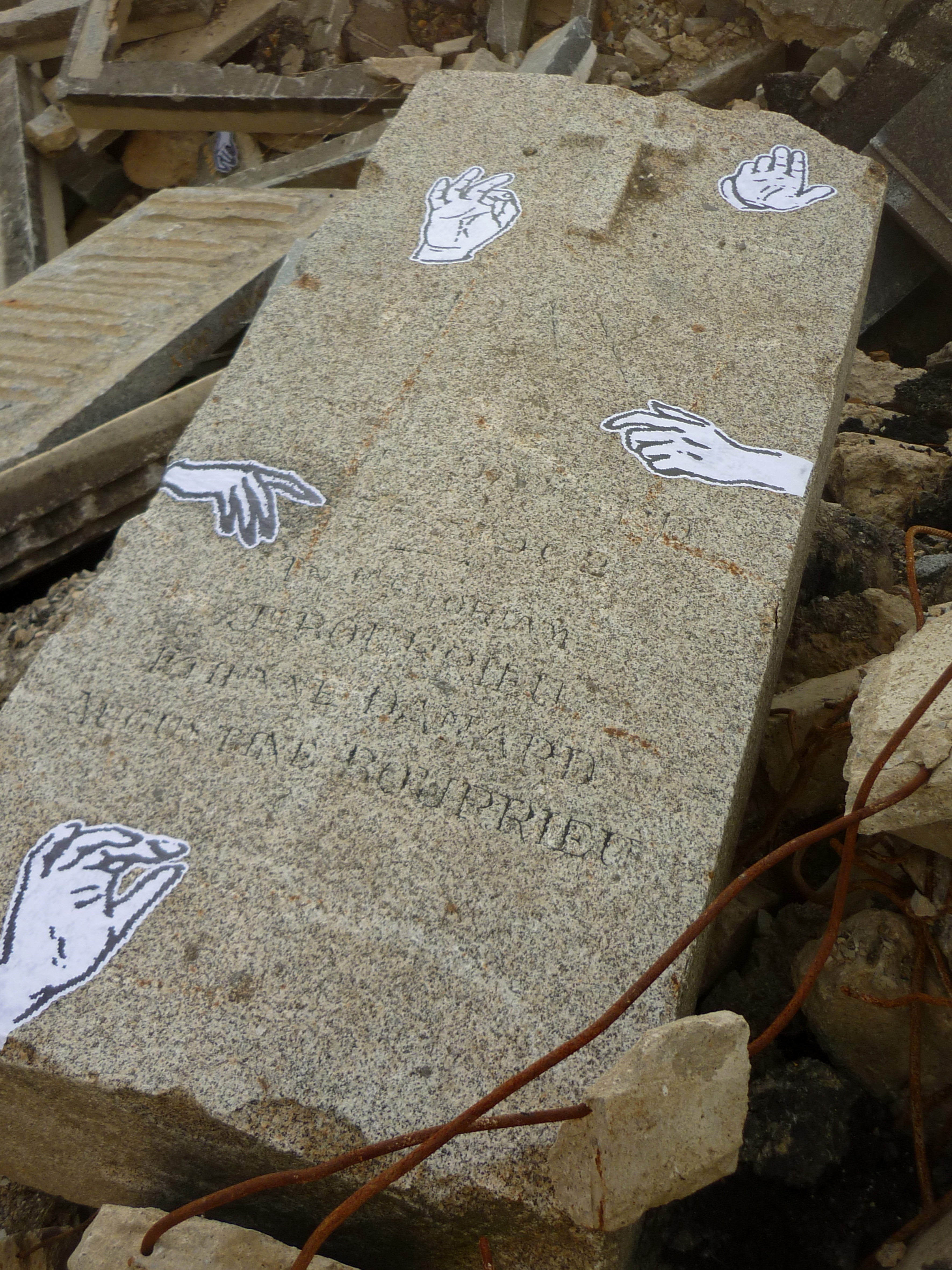 After discovering interesting places, i like to go back and put my artwork and i try to make senses with my posters. For this project, i put some hands in the rubble, near the tombs. The black and white copies refer to the ghosts… It's not the first time i use these patterns… LA MAISON GANTÉE in 2008 (a play with la maison hantée, the haunted house and gant who means glove) GHOST SHIP in 2012 were interventions where i put some hands on an abandoned house and on an old vehicle. I decorated a piano too …