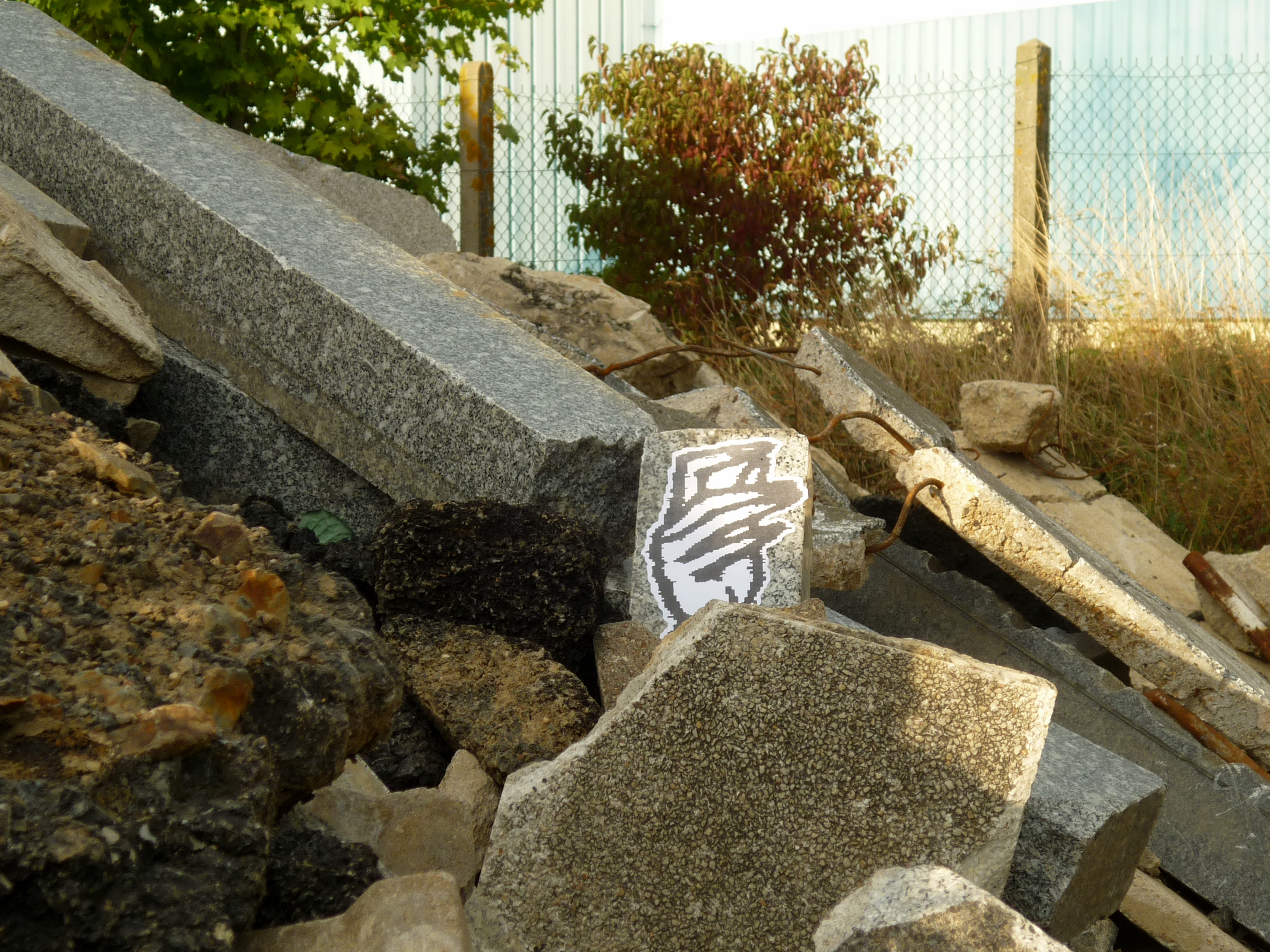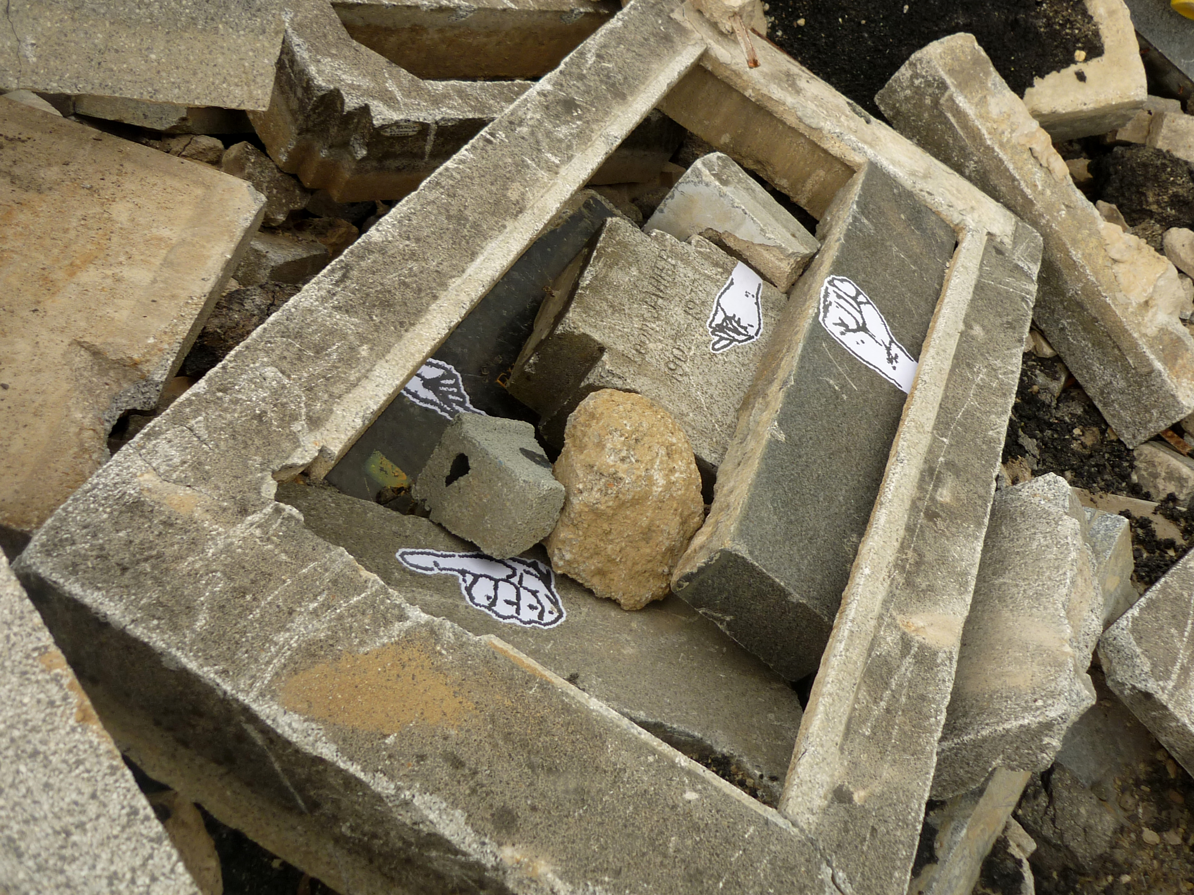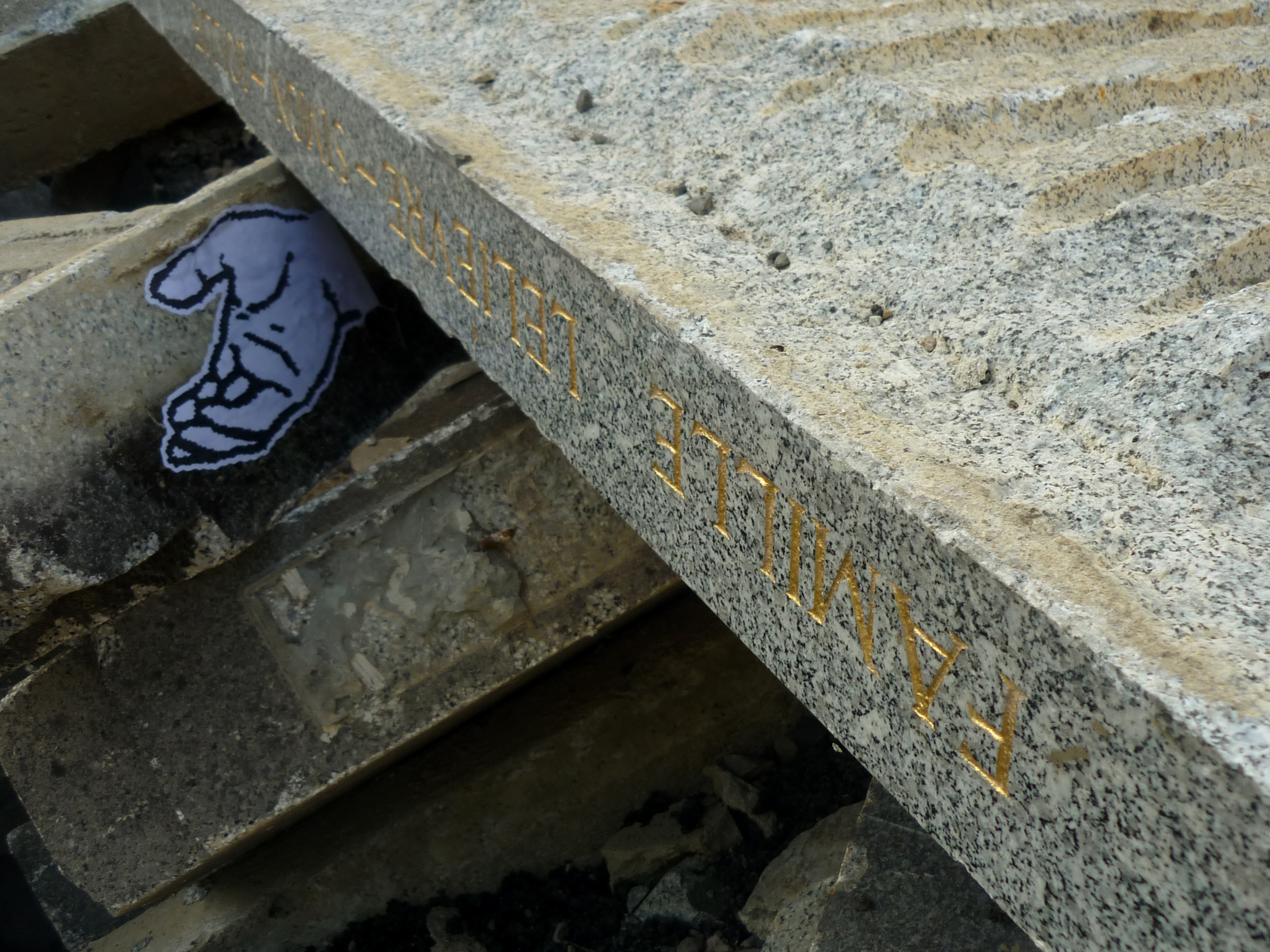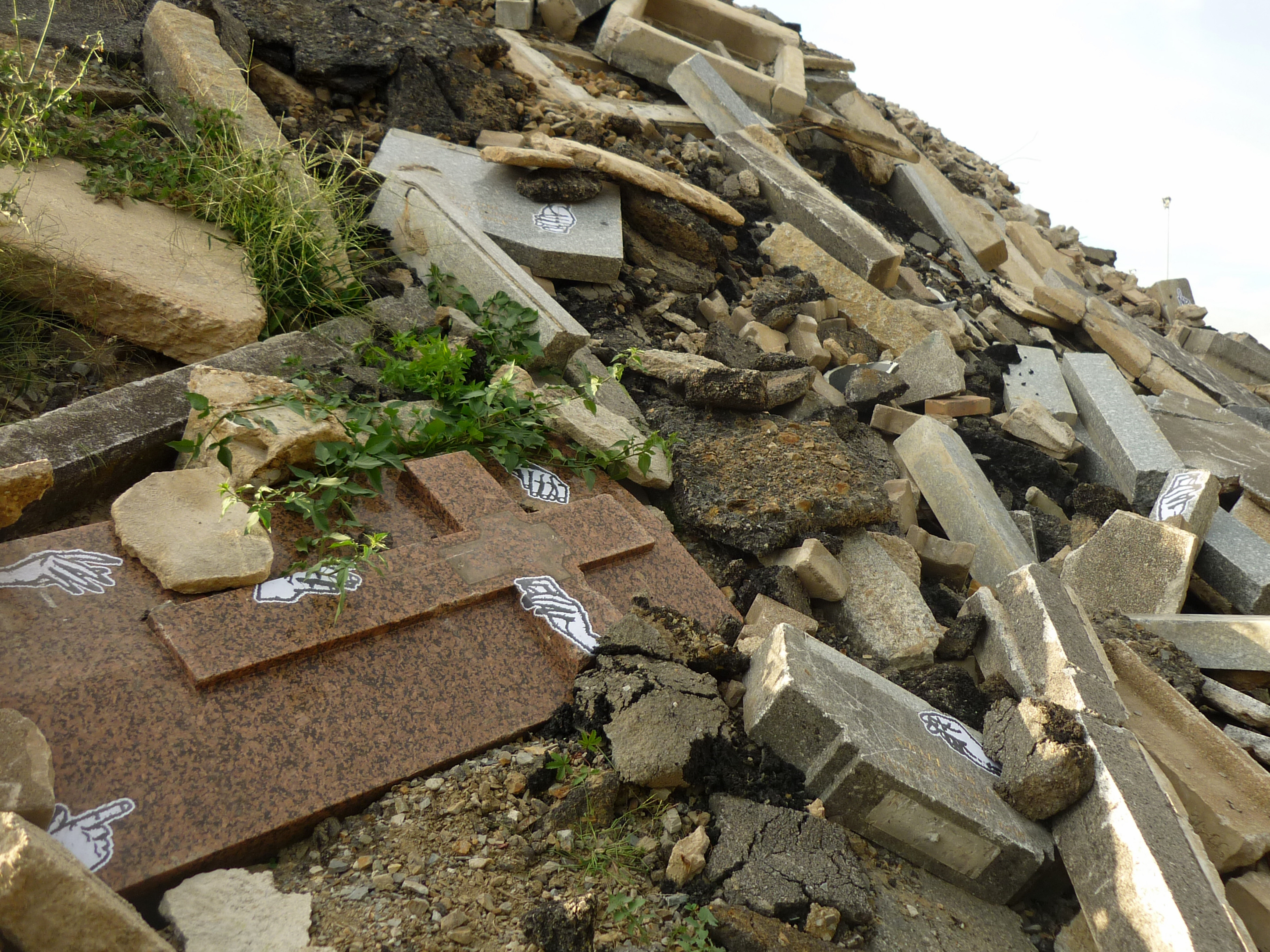 After discovering interesting places, i like to go back and put my artwork and i try to make senses with my posters. For this project, i put some hands in the rubble, near the tombs. The black and white copies refer to the ghosts… It's not the first time i use these patterns… LA MAISON GANTÉE in 2008 (a play with la maison hantée, the haunted house and gant who means glove) GHOST SHIP in 2012 were interventions where i put some hands on an abandoned house and on an old vehicle. I decorated a piano too …