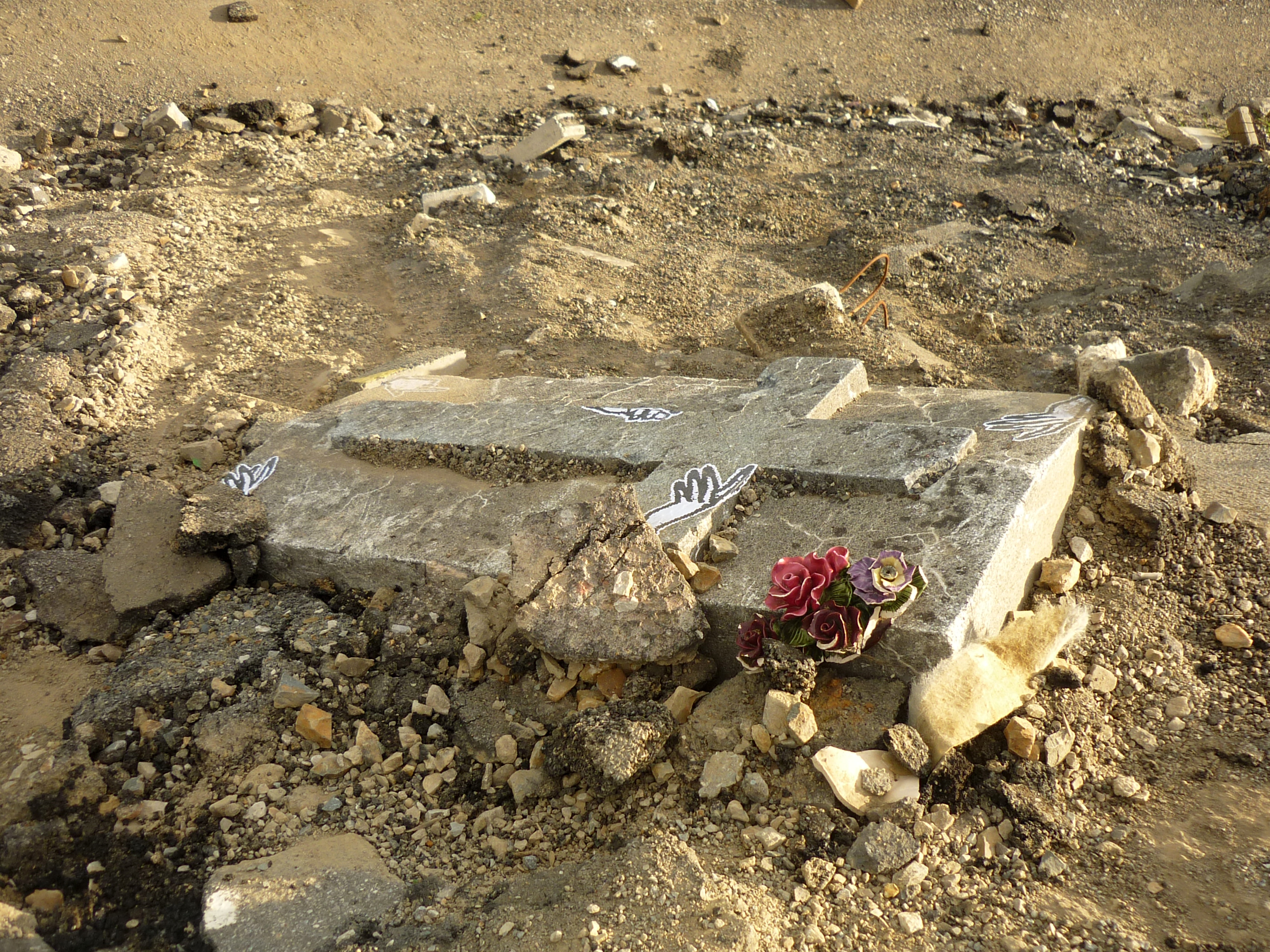 It's a reflexion about our society and the place we give for our deaths. The Cemetery is too small and we put the old tombs in a wasteland. This action reminds me the war, the cities under the bombs, terrific situations that we saw every days in the newspapers… . Of course, the rubbles refer to the earthquakes… Here, the scene takes place in France, not in a poor country where there is civil war or natural disasters with lot of dying people.