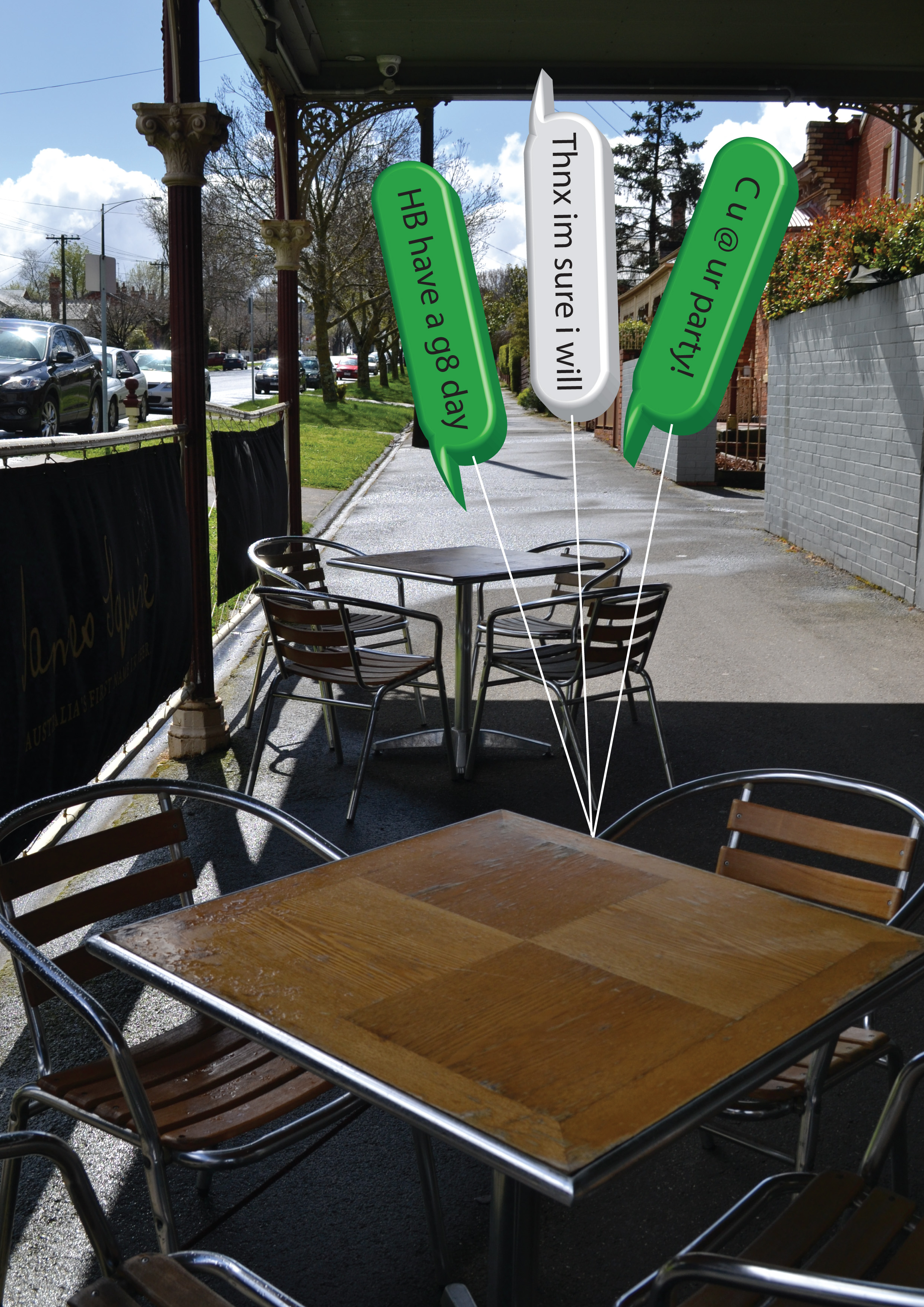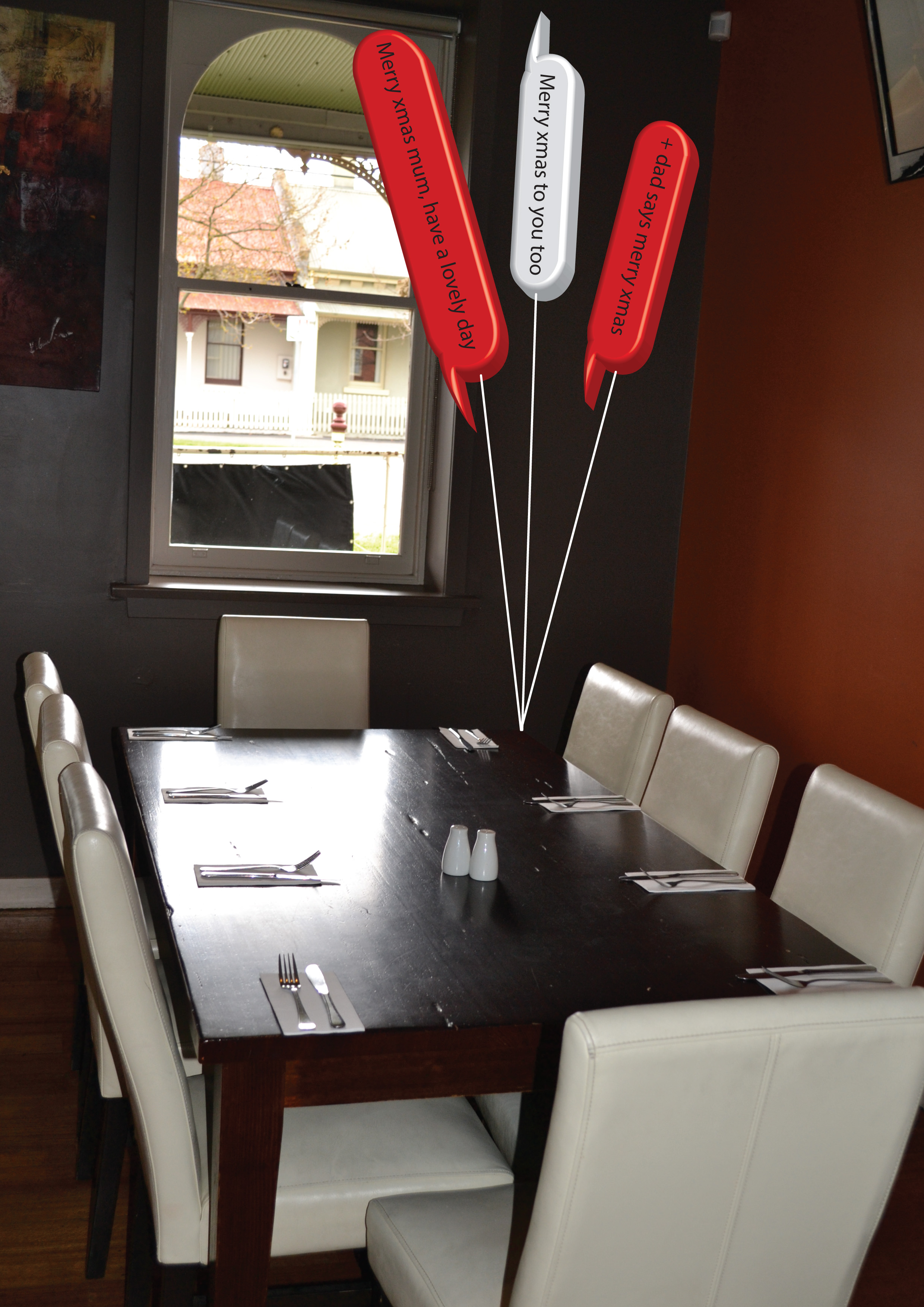 I feel my work is good communication. I have put a spin on what is a scene of where we would catch up with your friends or family and also places that we go to celebrate occasions. But now these places are left vacant because we don’t create this form of dialogue anymore; it has changed. The photographs I have taken give a good representation of an empty space that should be filled. The text bubbles that are balloons look like the conversation threads on a phone, so this really ties in the whole ‘behind the phone’ aspect, but the emptiness of personal communication and dialogue.