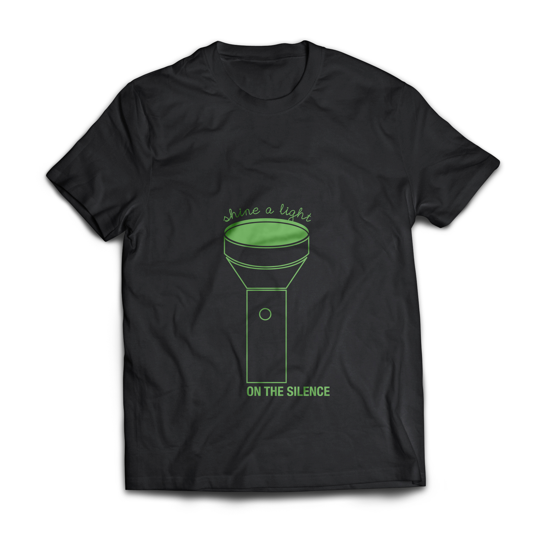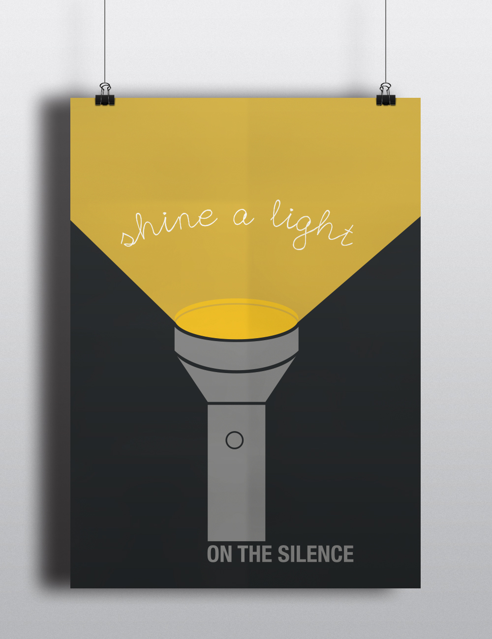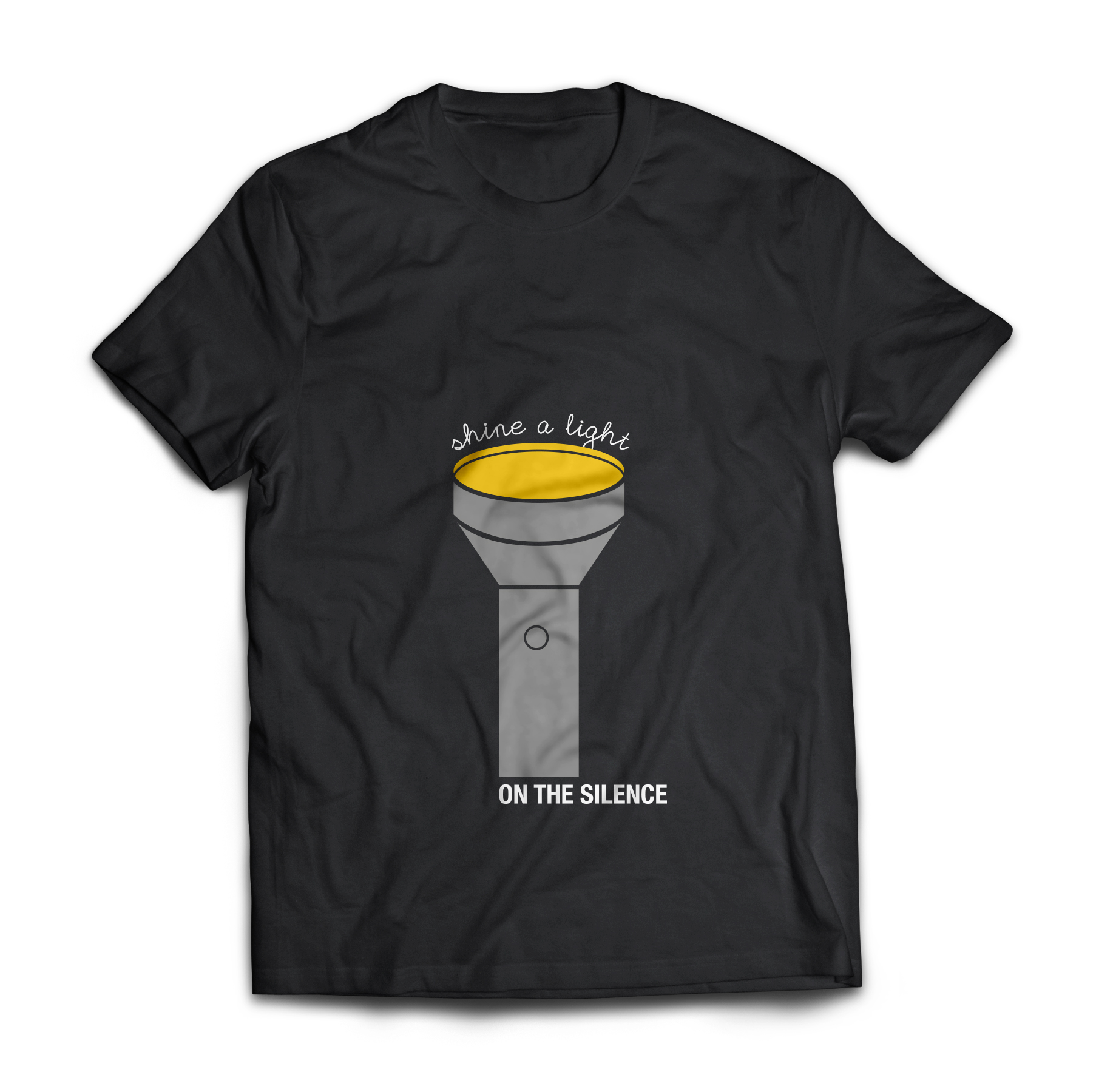 a good slogan, but why the lamp and a second slogan "shine a light on the silence?" because you have been tought so in advertising. In my mind it's too much. try it one time without all these artifivial illumination: print 4 T-shirts with