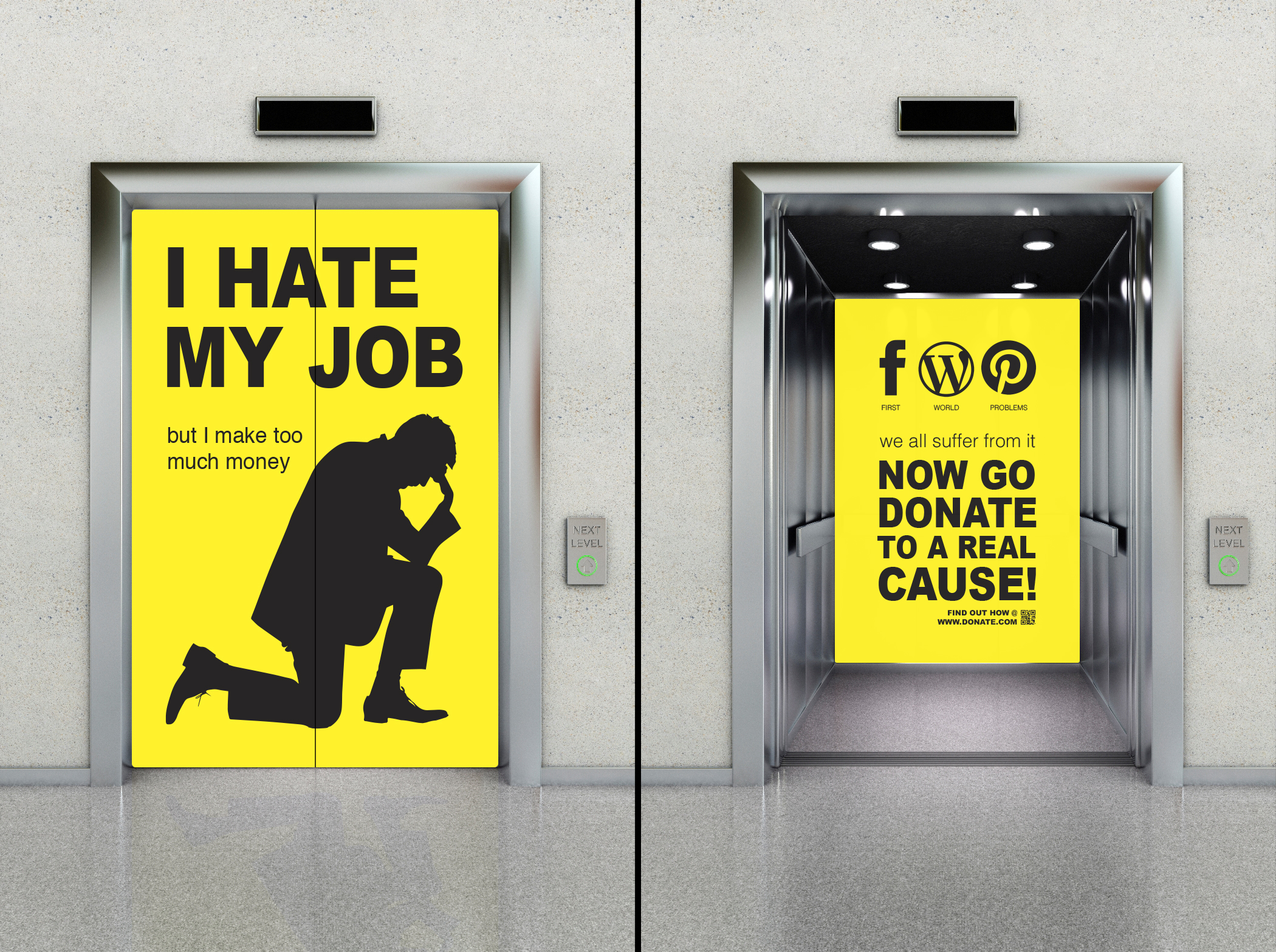 I would consider my work good advertising design because it informs the public of a noncommercial idea. There is a dialog between the viewer and campaign in which the viewer has the opportunity to visit the web link by scanning the QR code in the elevator itself and donating some money to whichever charity they choose. (The website is non existing for the purpose of the brief)
