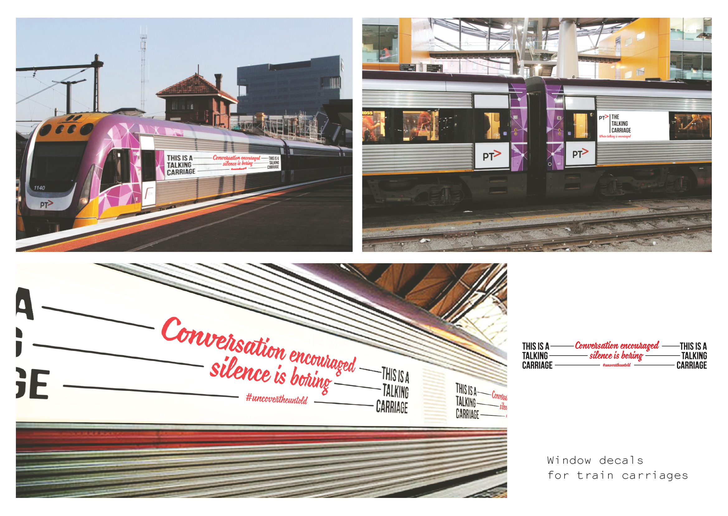 My communication approach includes the use of graphic signage on regional trains, in big city train stations and in the rural spaces. The communication on the signage includes casual quotes promoting the idea of talking to the people close by to you and also the idea of people “uncovering the untold” which is a nice casual approach again for people to start communicating.