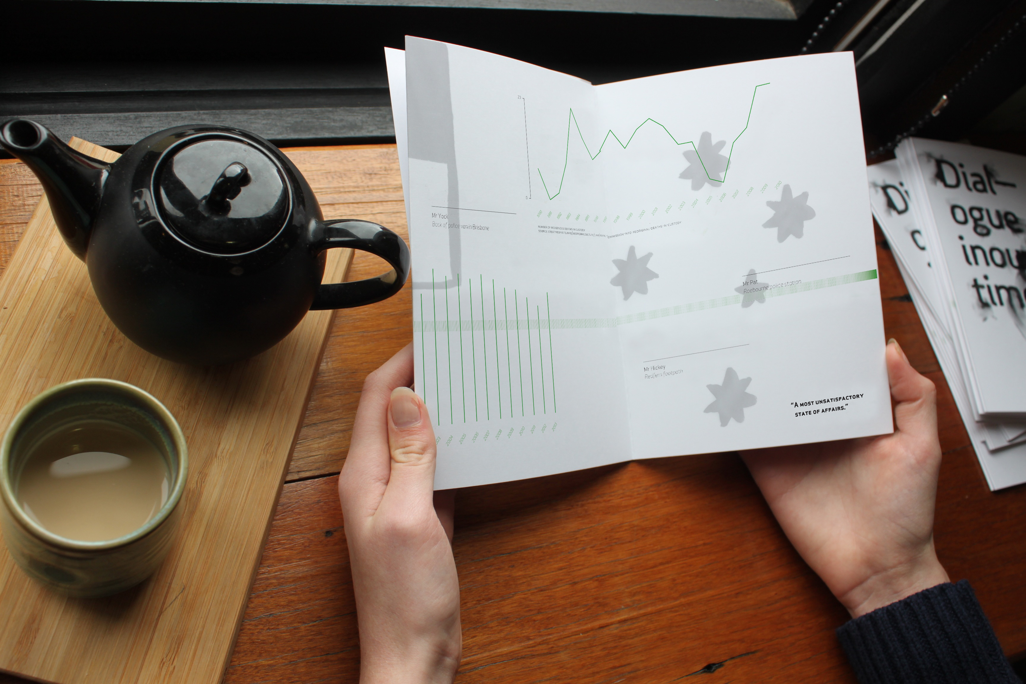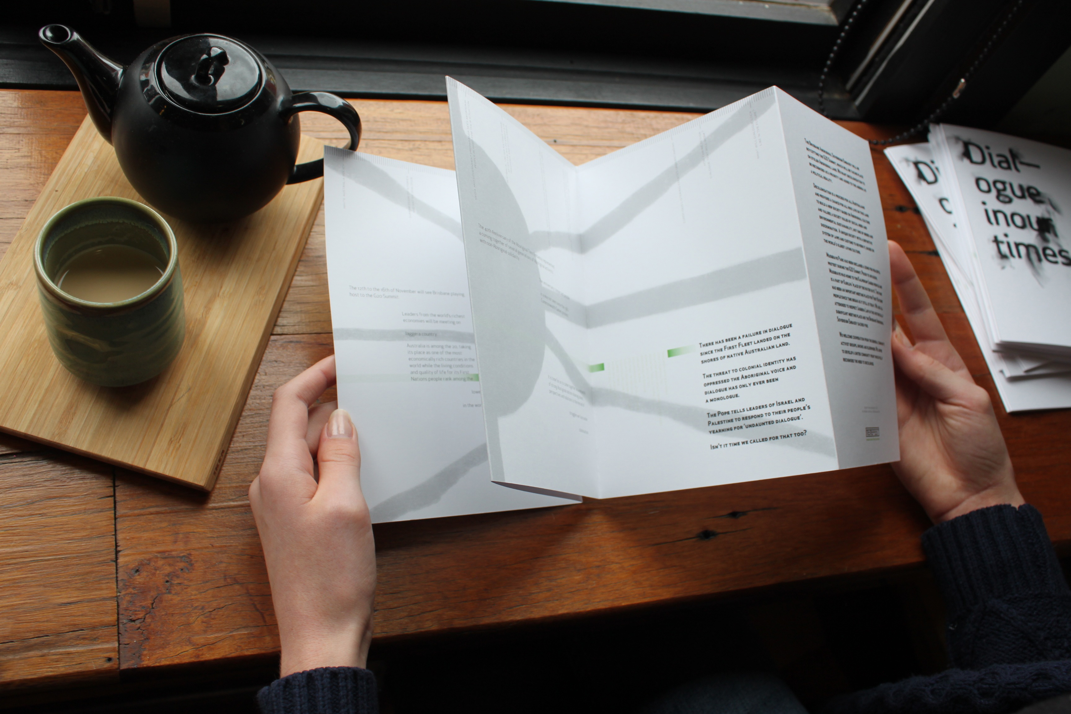 'Remember Our First Nation People' speaks to all non-Indigenous Australians to raise awareness about the G20 Summit being held in Brisbane on Jaggera land in November this year. It illustrates a press release from the Brisbane Aboriginal-Sovereign Embassy through lyrical typography with a timeline of key failures in dialogue between Australian policy makers from the time of invasion up until today. It is this failure in dialogue that keeps Indigenous Australians oppressed and living in third country conditions. And the media propaganda that keeps them there, out of sight and mind from the general public. The timeline takes readers up to the times of today and poses the question, "How can we design dialogue that will work?" with hope that the protests at the G20 Summit will keep the plight of Indigenous people around the world in the forefront of the minds of the world's leaders. The reverse side of the design illustrates a news article promoting a 'deaths in custody protest at G20' and features several names of Indigenous people who have died in police custody recently that have caused outcry due to their inhumane circumstances and lack of police prosecution. This text is accompanied by graphs showing statics over more than 10 years of rates of Indigenous in jail and rates of Indigenous deaths in custody. Both with staggering figures. Overall, it is the non-existence of dialogue that keeps the conversation a monologue. The Pope has called to the leaders of Palestine and Israel to have 'undaunted dialogue' and I think it's about time we had that too.