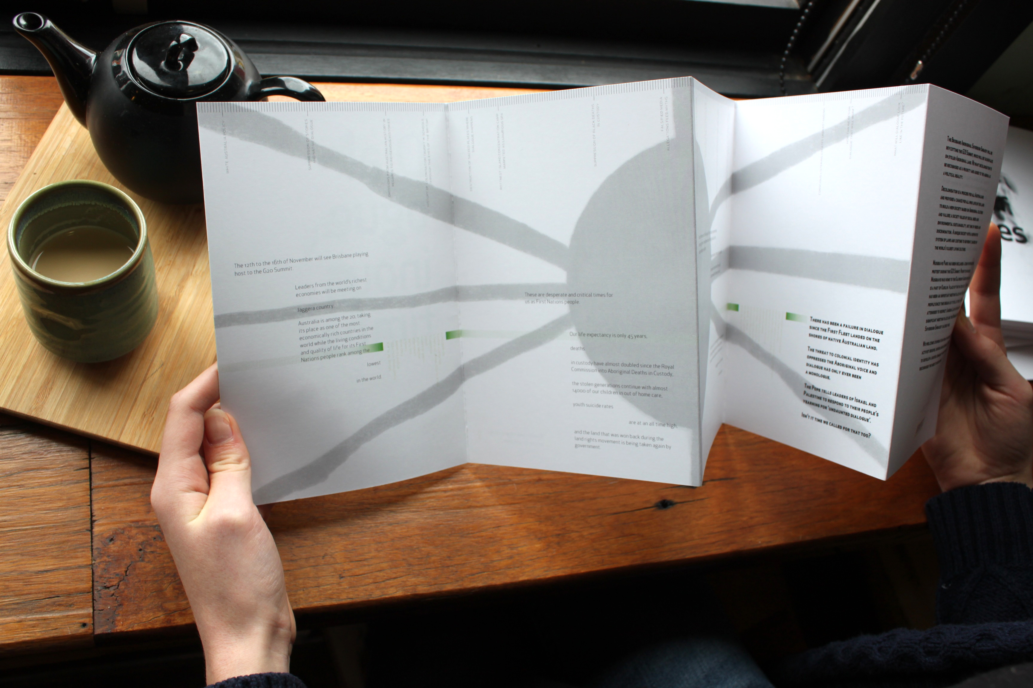 An A5 concertina fold brochure that looks more artistic than activist to attract a variety of non-Indigenous readers. A solid piece of design that feels special and worthwhile keeping, in the hope that readers take the piece home, consider attending the protests or showing support in anyway they can.