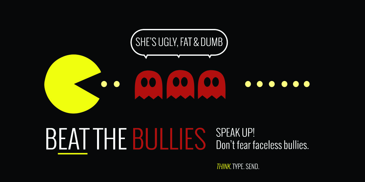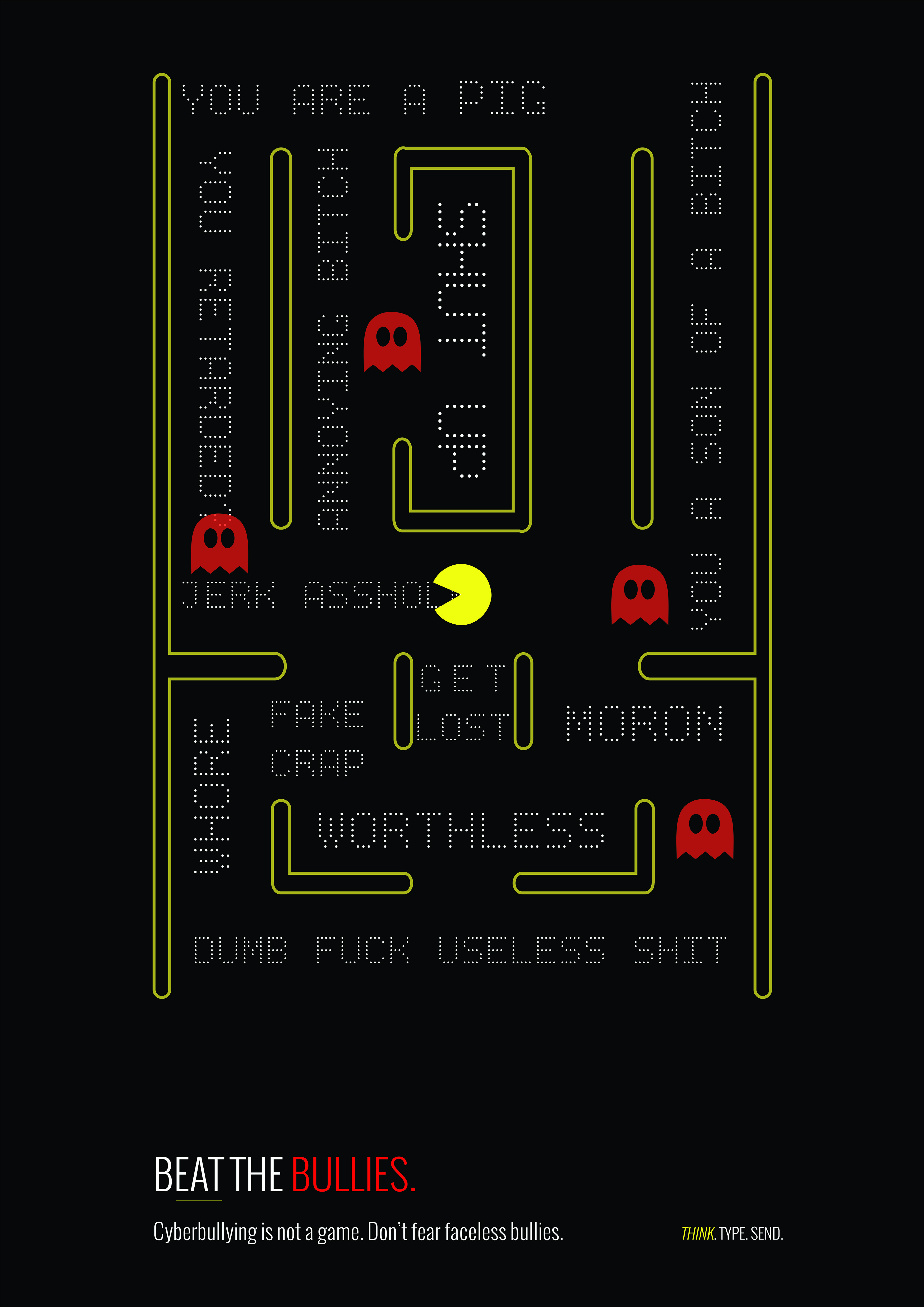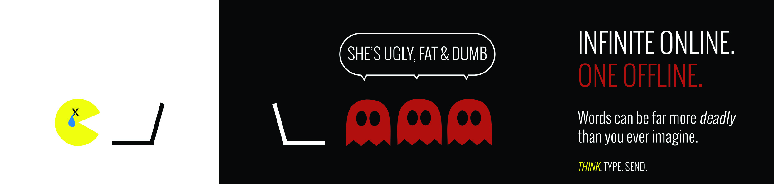 I am using Pac Man as my hero of the theme, with elements of it, for instance, pixelation and characters to represent the use of electronic devices. As Pac Man being my hero of the theme, I basically use the idea of the game - Pac Man being chased by ghosts while eating away the yellow dots. In my version, the Pac Man is being the innocent person on the internet and ghosts as the bullies that tend to leave unwanted criticism. Being chased (stalked) by ghosts (bullies) on the internet, Pac Man (bullied person) is forced to eat away all the criticism left by ghosts. Pac Man aims to attracts the correct age group of people (generation Y and Z), that goes online more often than other generations, with the graphic as plus points it attracts attention as Pac Man is one of the most favorable game of all times."