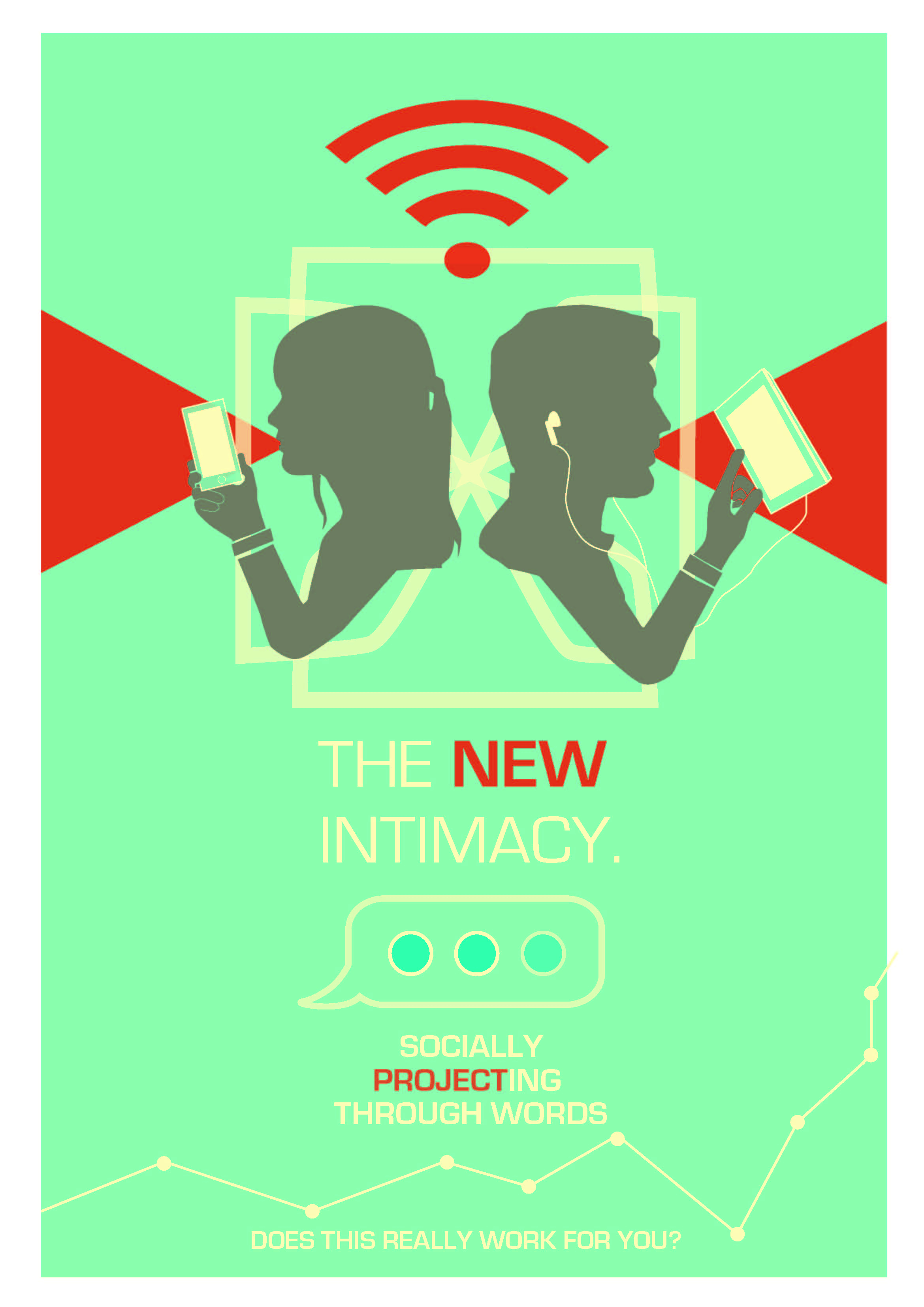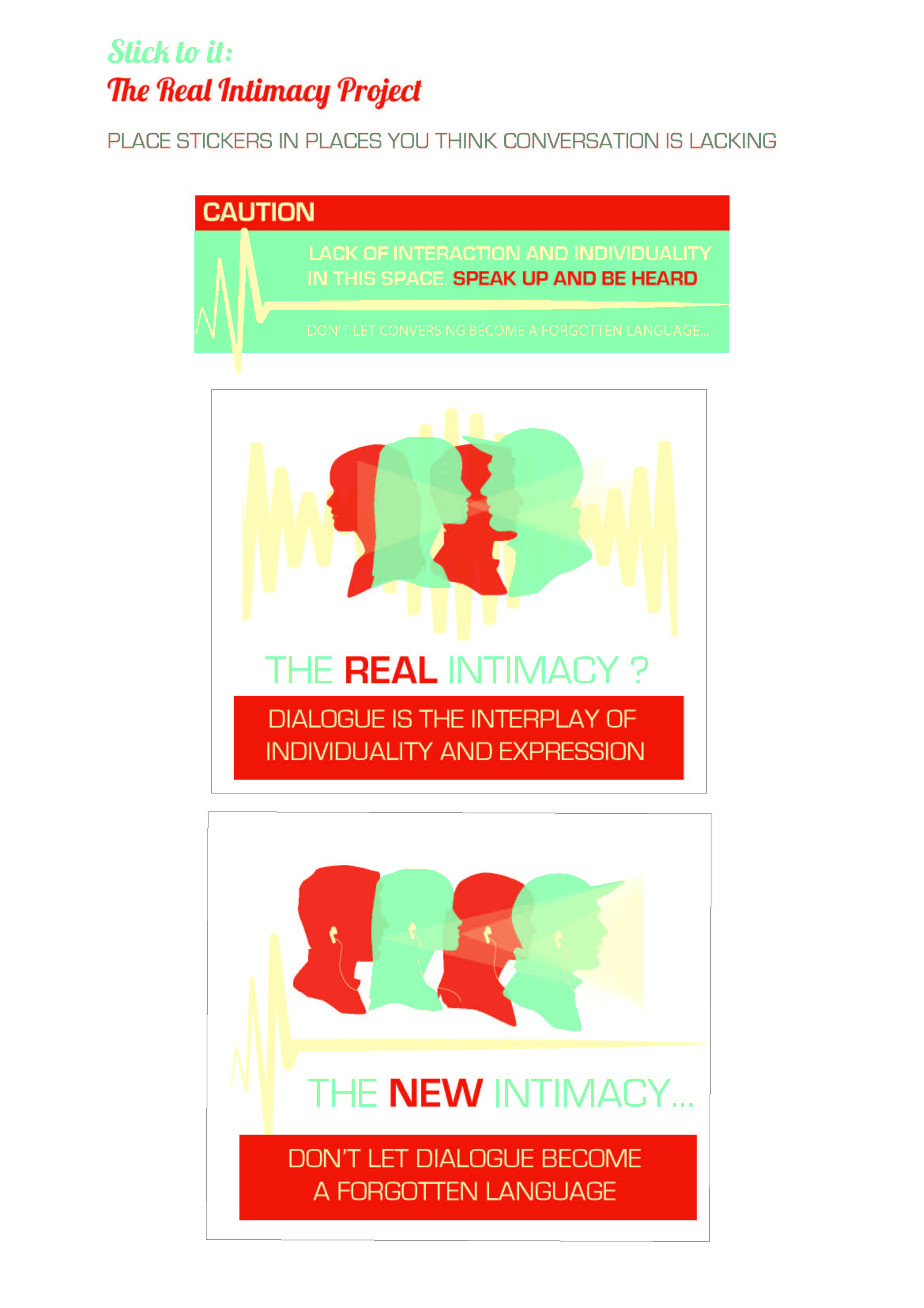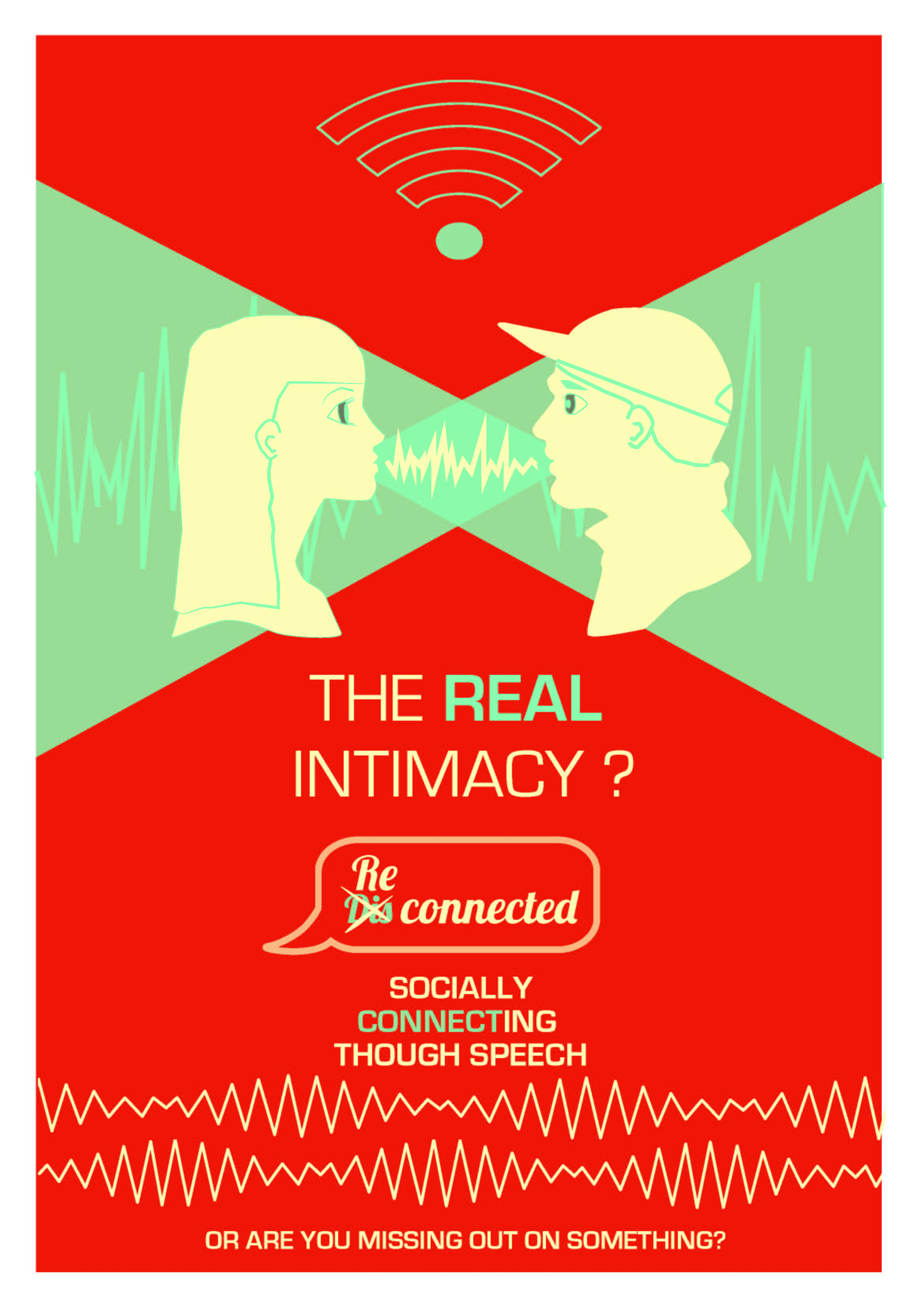 Personally I see my work as good design has it shows tension and contrast through a cohesive colour palette so both sides to communicating can be explored while still appearing as part of a whole. Using simplistic vectors, repeated elements and simple, direct language I aim for the message to be immediate and ingested easily by the audience. It asks questions and makes the public question how they interact in the public space. By replacing simply elements and shifting profiles I show two extremes of communication and use graphics to enhance the language. By adding a question mark at the end of real intimacy it asks for own interpretations and opinions, creating dialogue. To me good design means it can reach the audience through simple direct messages that are understood quickly and enables them to be active in interpreting the message.