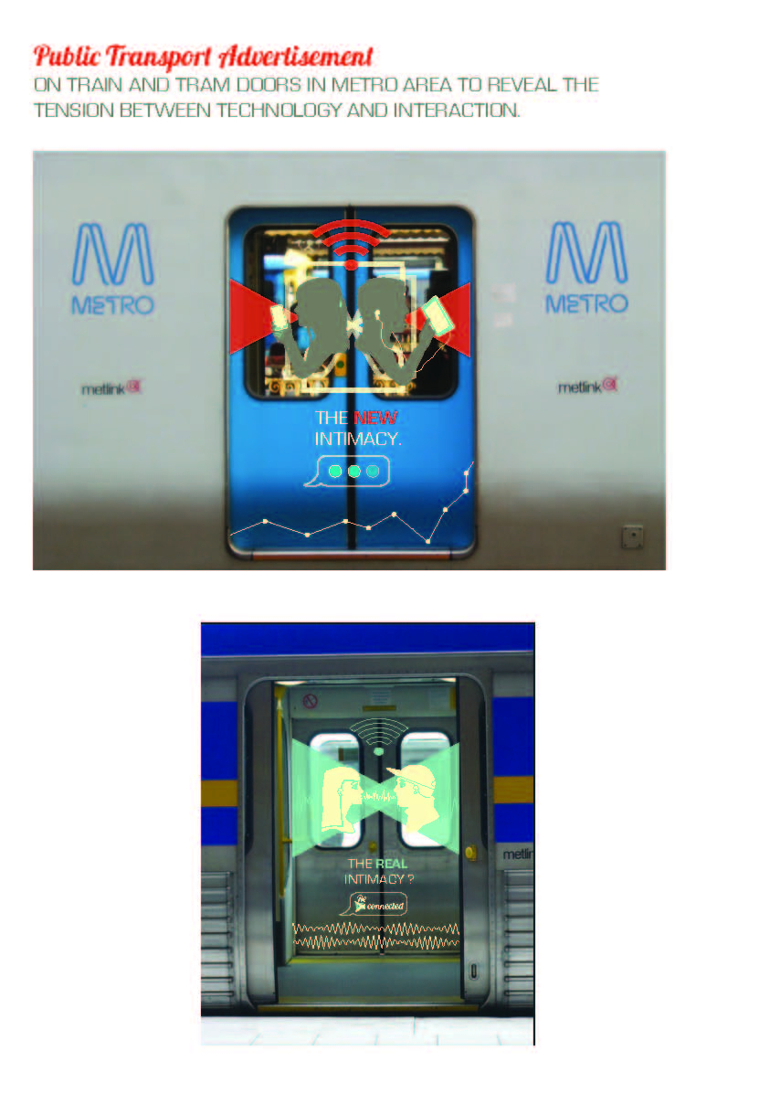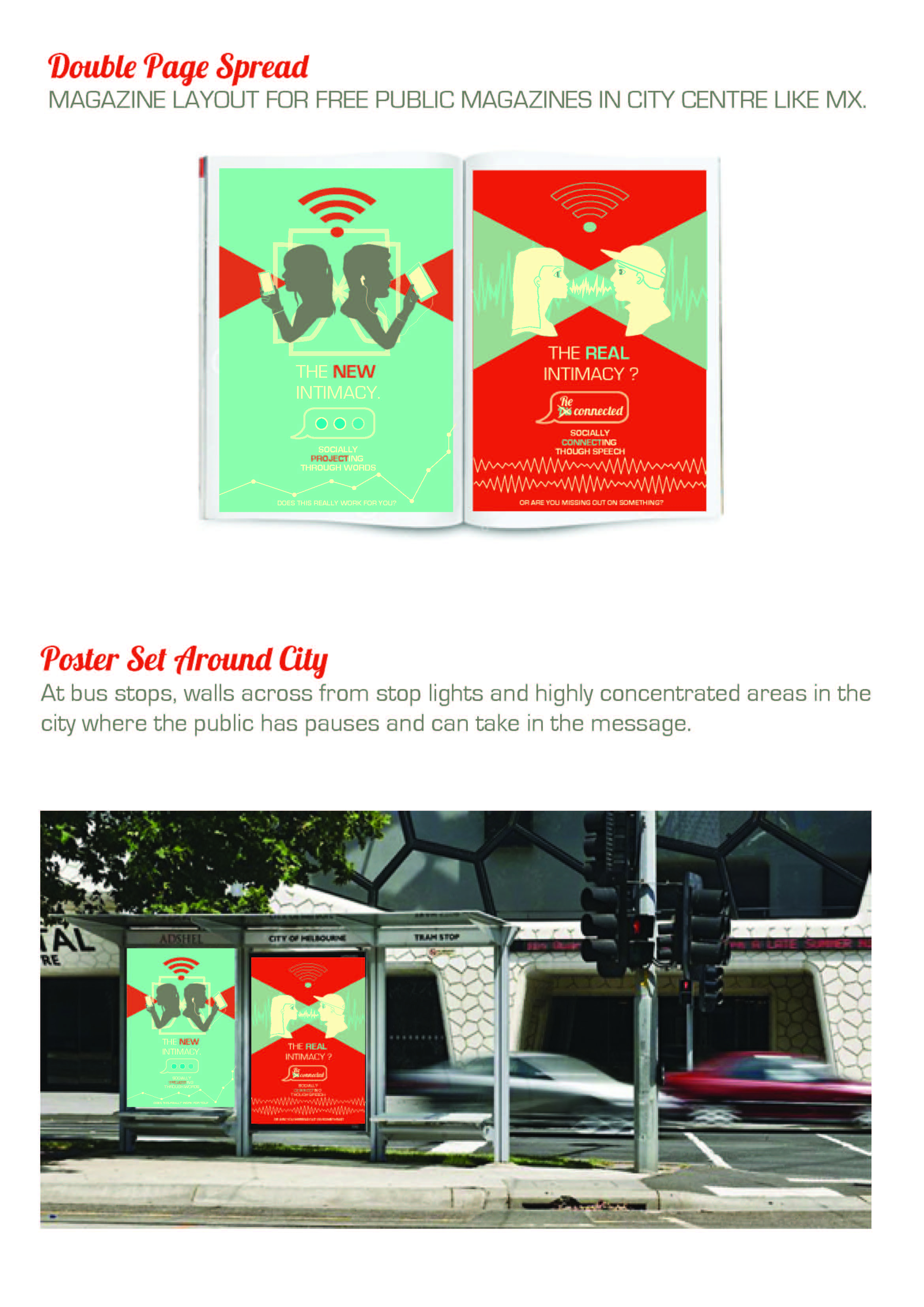 I want my campaign to be dominant in the public space, in highly condensed areas such as Melbourne city and eventually expanded elsewhere, in places where people have time to ingest the information and question their own ability to communicate on an intimate level when interacting with the hindrances that are interfering. It aims to show shared experiences we are missing out on by dispersing our attention into social networking, where we feel we are connecting on a personal level when we are closing ourselves of real life experiences. It is our individual features that makes us unique and differences that unit us, our reaction, expression, opinions and immediate responses when participating in dialogue that makes it so personal, direct and intimate. For this purpose my campaign will feature in the public eye and instigate interaction and attention in places where people are more stationary and attentive, such as train stations, public transport, in papers and within the public space. While online and media campaigns may work as support materials to create a community around the campaign to give it more depth, the first encounter will be in the streets.