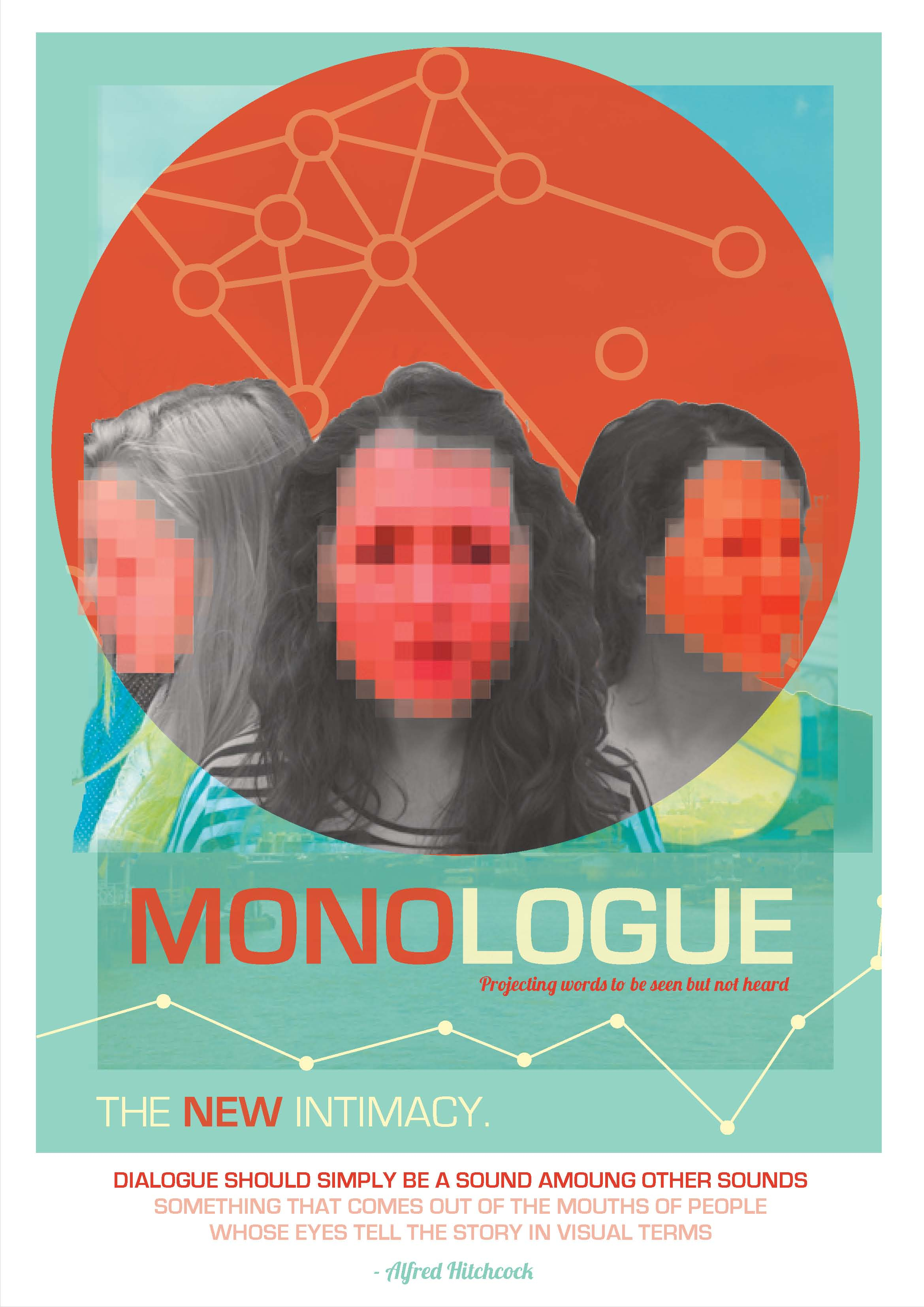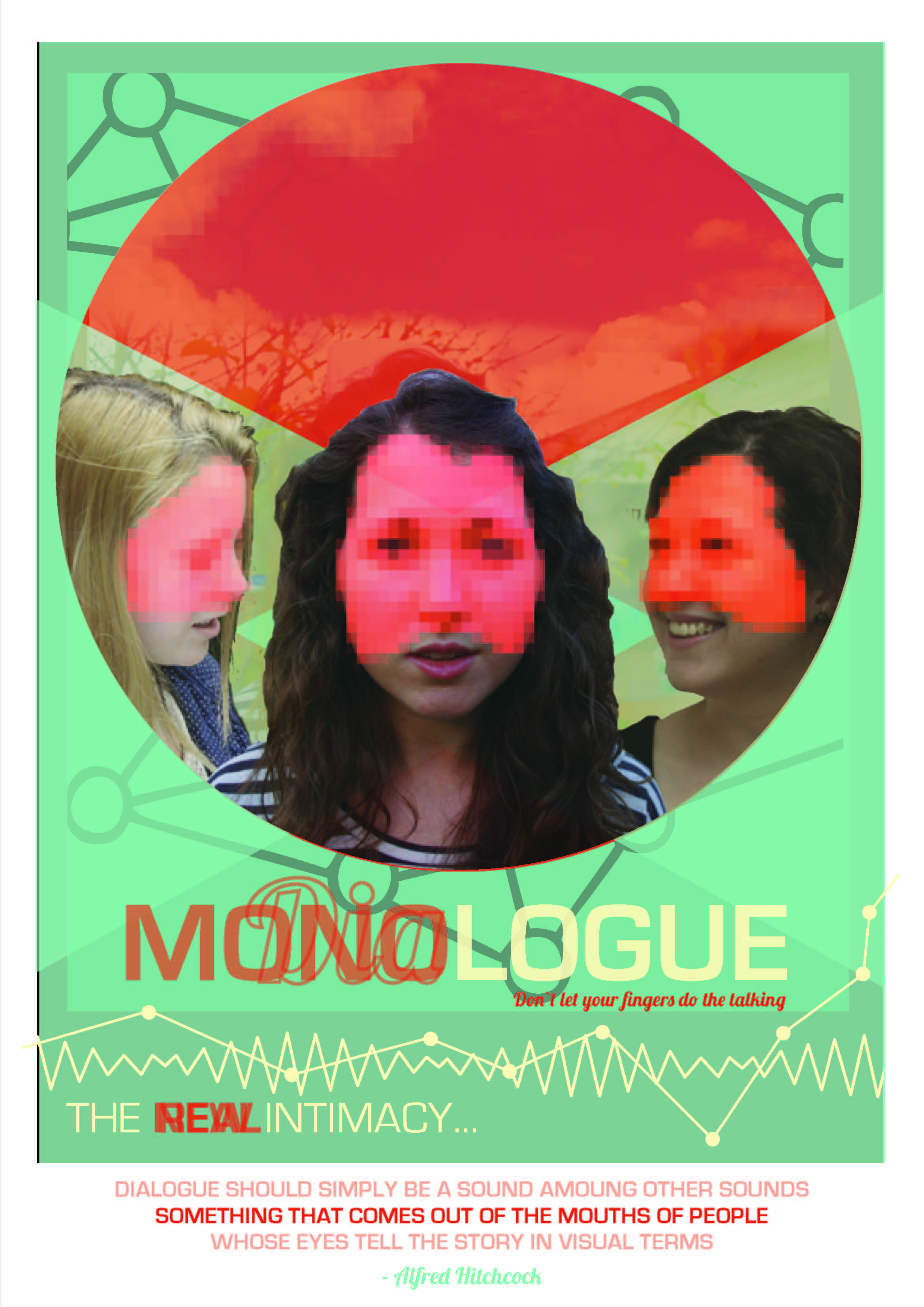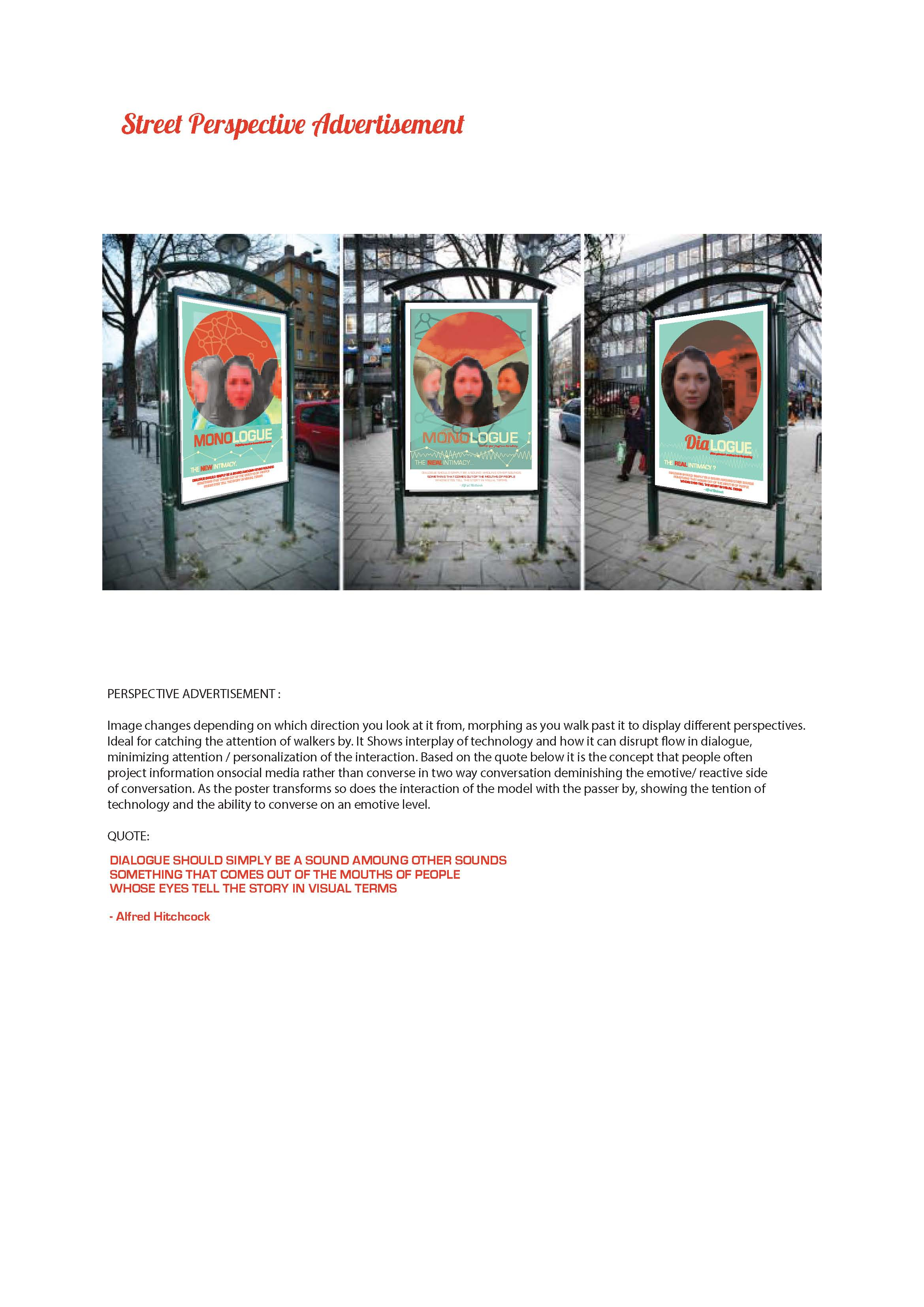 I learnt that there are many facets to dialogue and that it isn’t linear or straightforward. I don’t think dialogue is necessarily failing but evolving into the technological error where instead of interacting face to face people project their thoughts to a mass of people in hope of a response, the dialogue is disjointed and over longer periods of time. I believe at the root of creating intimate connections through communication is the atmosphere; I think it is enhanced by emotions, gestures, eye contact. For me dialogue is about the whole expression not just what comes out of the mouth, it is immediate and responsive, this can be difficult in modern times when our attention is dispersed in multiple directions and everyone is always switched on. For me personally the brief was difficult to interpret but it forced you to really digest it and was widely open to interpretation. When I was creating my campaign the most important thing I learnt in the visual stage was to create tension and contrast with cohesion.