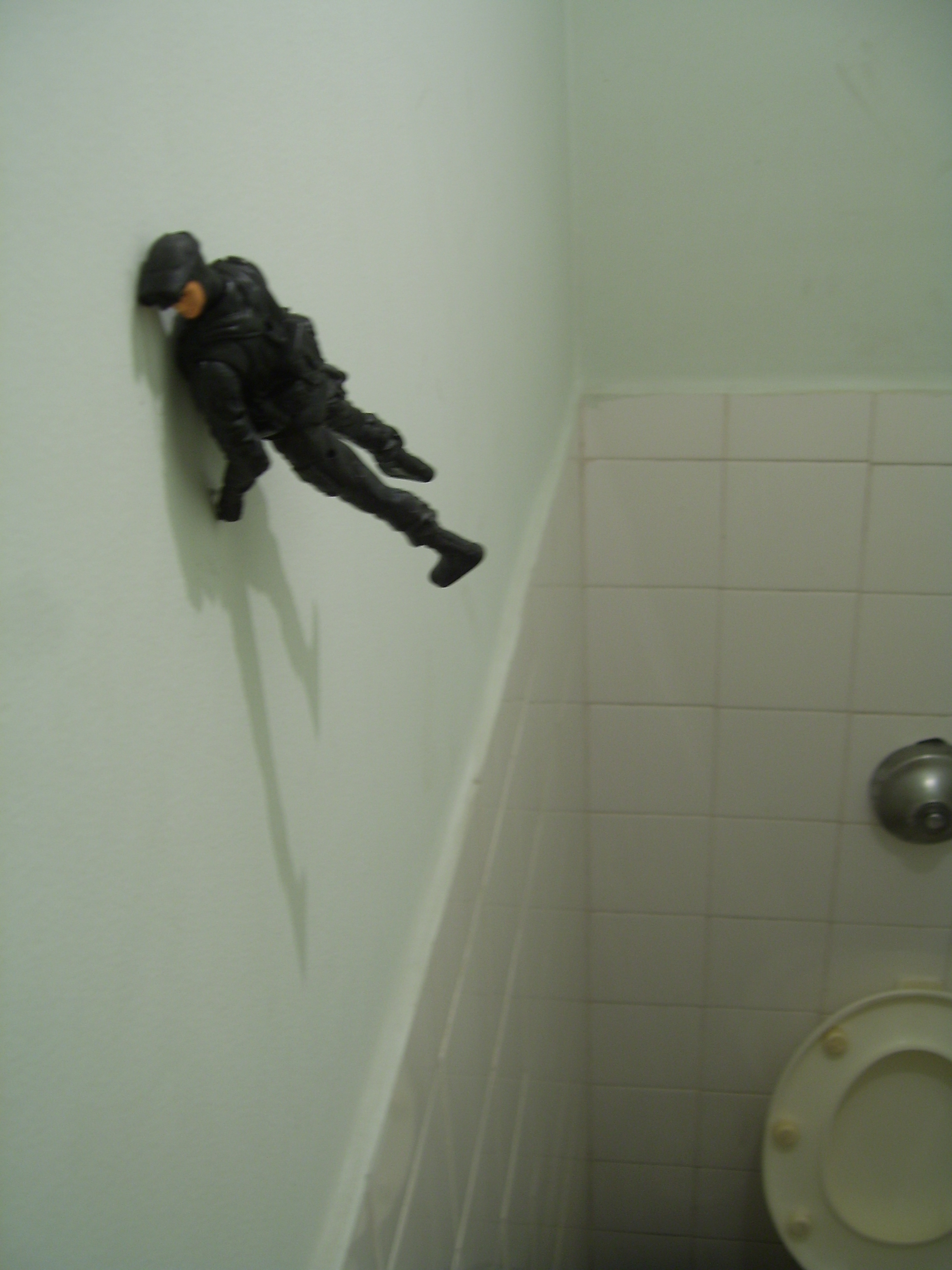I take small toys I find or friends give to me, and glue them to signs,walls,windows or scupltures in the city, always trying to create a funny,critical,joyous, sometimes even tragic relationship. Sometimes, interfering with a small toy,a whole story is told.
