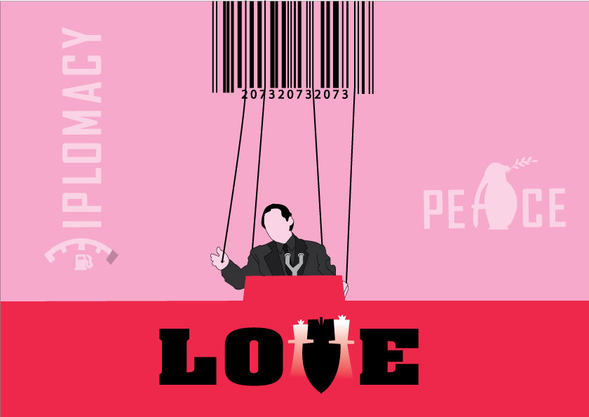 The poster shows how love today particularly in political speech is portrayed. A word devoid of its true meaning. Peace is war as Orwell knew years ago. Politic is in the hands of commerce and corporations, diplomacy is the word most often used for masking war. Where is the love? Is right out there, you can hear it, dropping from the sky and even more, you can hear it, when it hits the ground.