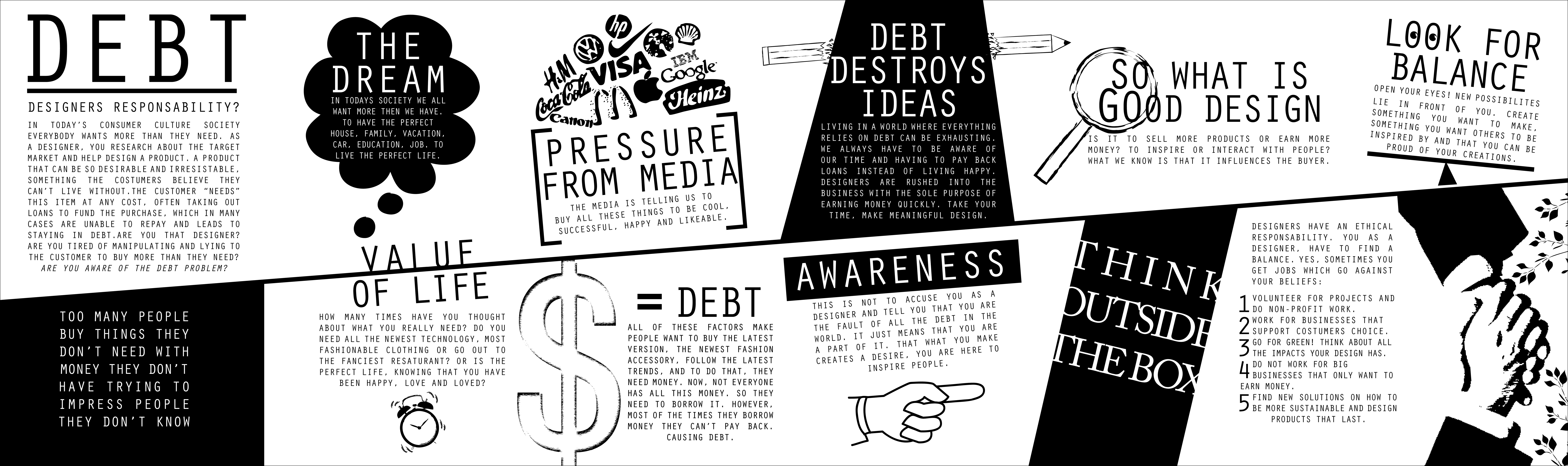 I wanted to focus on something more personal, and I believe as designers we are responsible for what we make. The best designers are the ones who think differently and find new ways of solving problems. We live in a world where we always want more. Adverts and new products tells us that we have to purchase these things to become happy, successful and likeable. To fund these purchases customers take out loans, which in many cases they are not able to pay off, leading them to staying in debt. We as designers create these desires, we all have a part to play. I created a poster (b&w for the environment) and a infographic inspired website which will contribute to the solution and help raise awareness of this issue.
